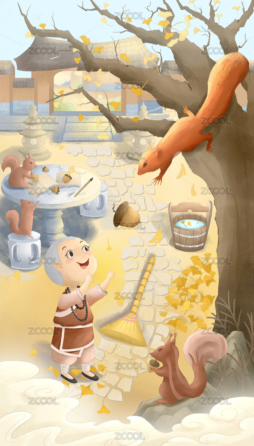 节气,小和尚,猫,朋友,伙伴,日常,佛系,儿童插画,小暑,晒