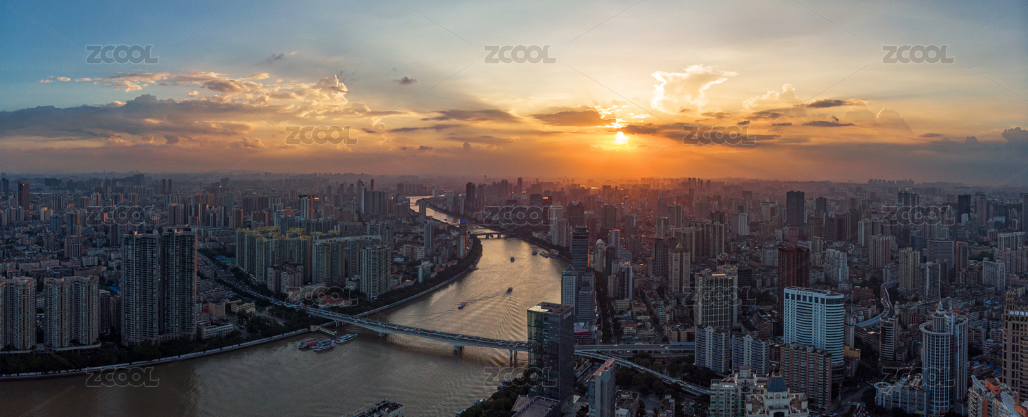 航拍广州珠江两岸城市天际线日落黄昏全景