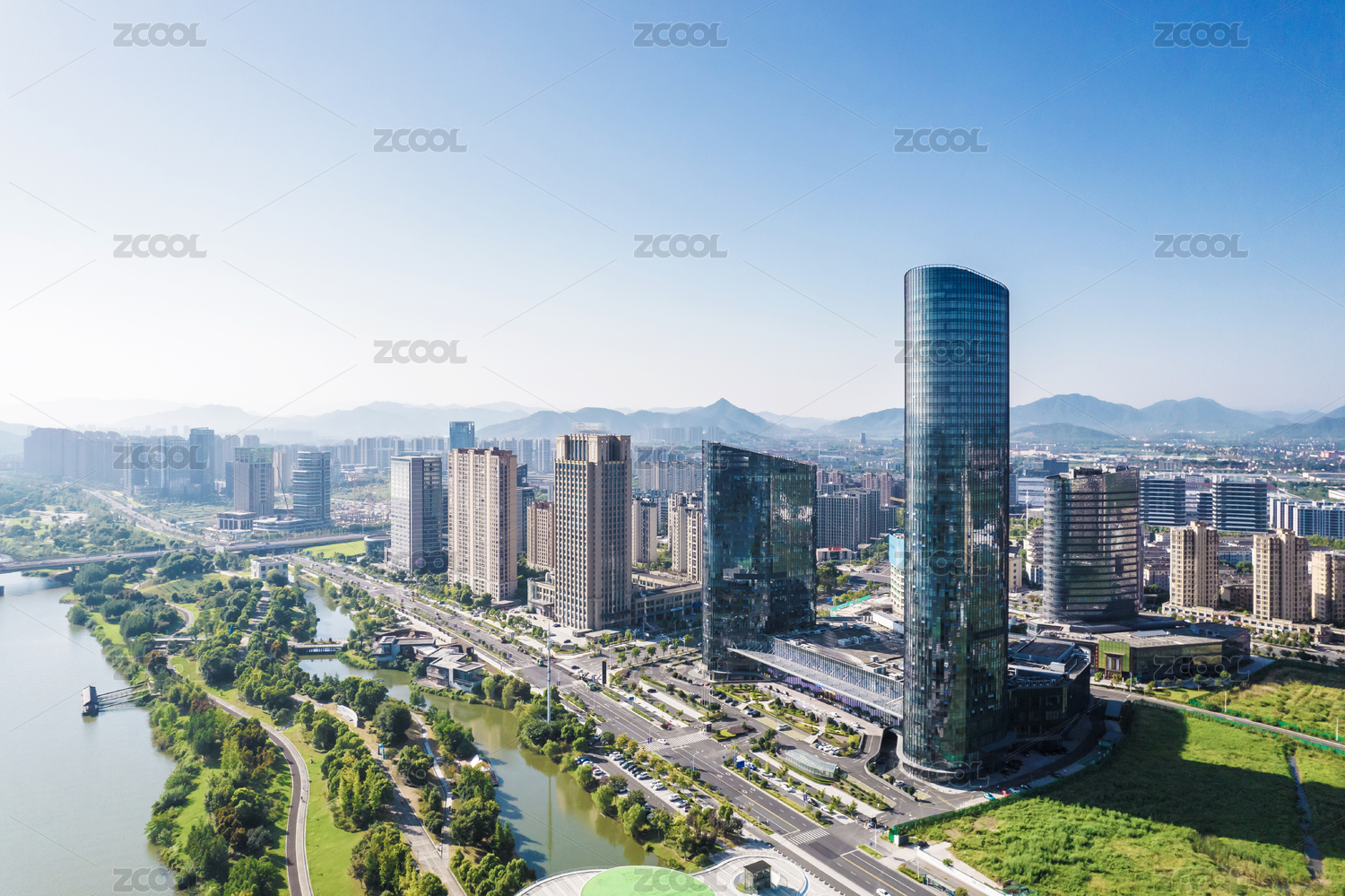 绍兴市上虞区曹娥江人行桥和江滨城市风光