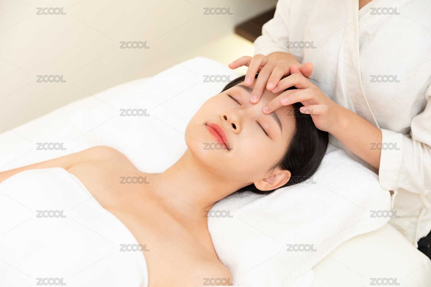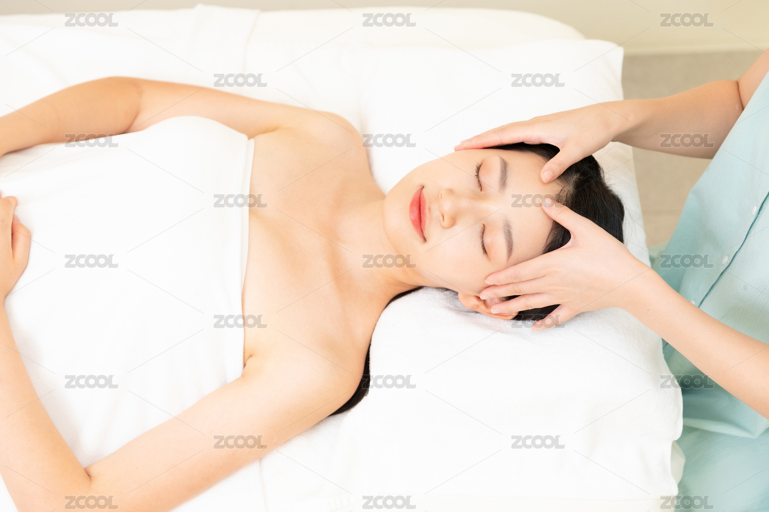 亚裔美丽的中国女人铺设胸部与中国中医诊所室内拔罐背部和闭眼治疗。医疗和健康理念。