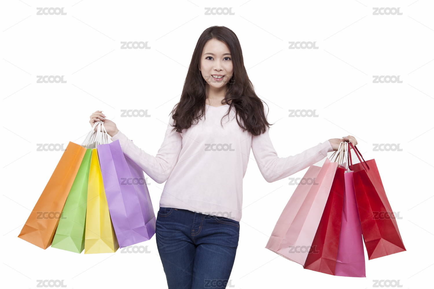 对中国持有袋上显示的商场很多贵重物品纪念日购物年轻女子隔绝在白色背景COPYSPACE。