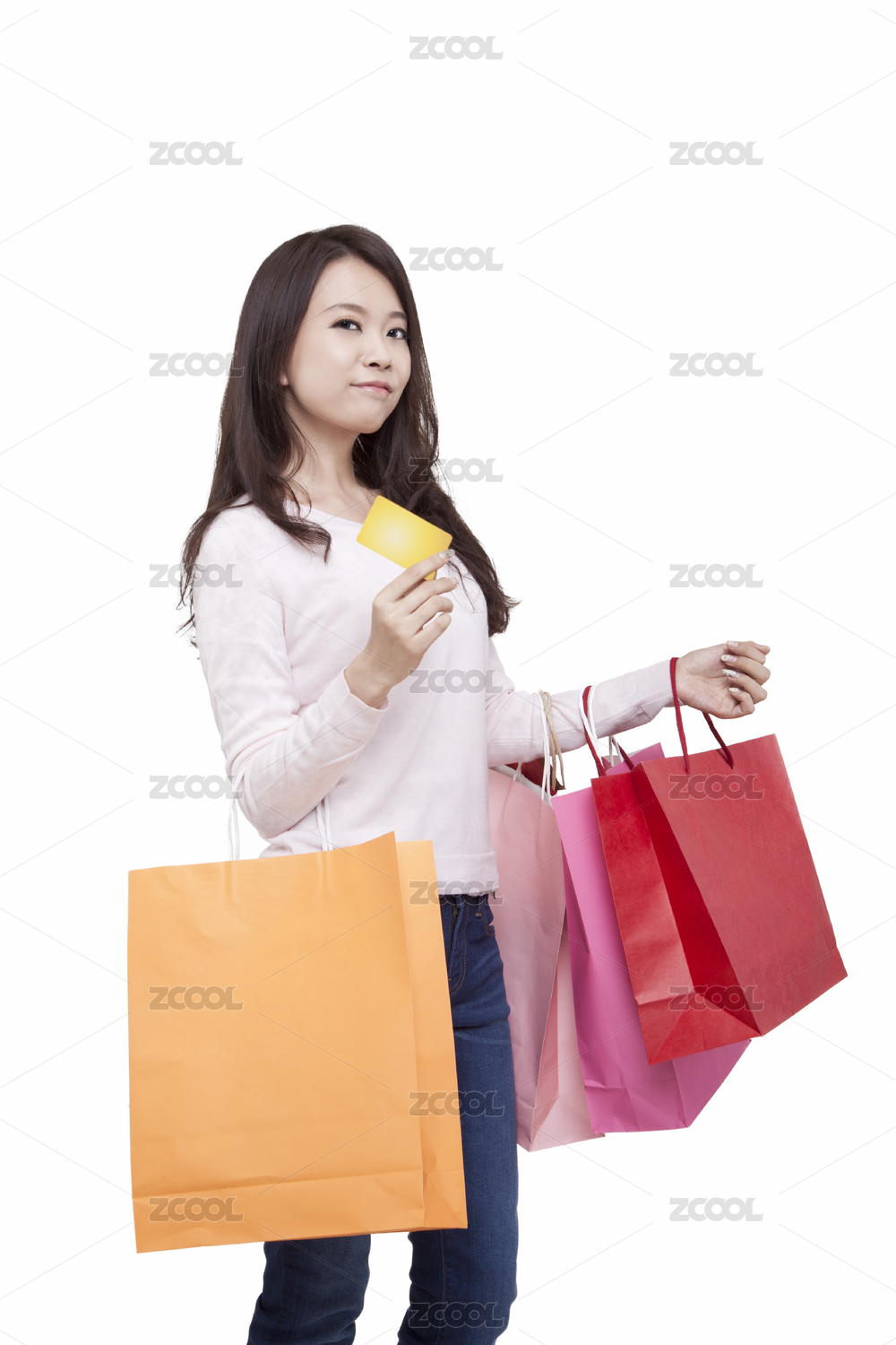 使用年轻女孩的信用卡在网上购物并进行隔绝在白色背景COPYSPACE空地区的许多五彩的纸袋。