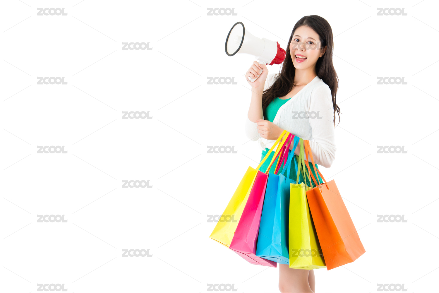 美丽的亚洲女子拿着扩音器大声呼吁商场周年店庆促销活动丰富多彩的购物袋。隔绝在白色背景。
