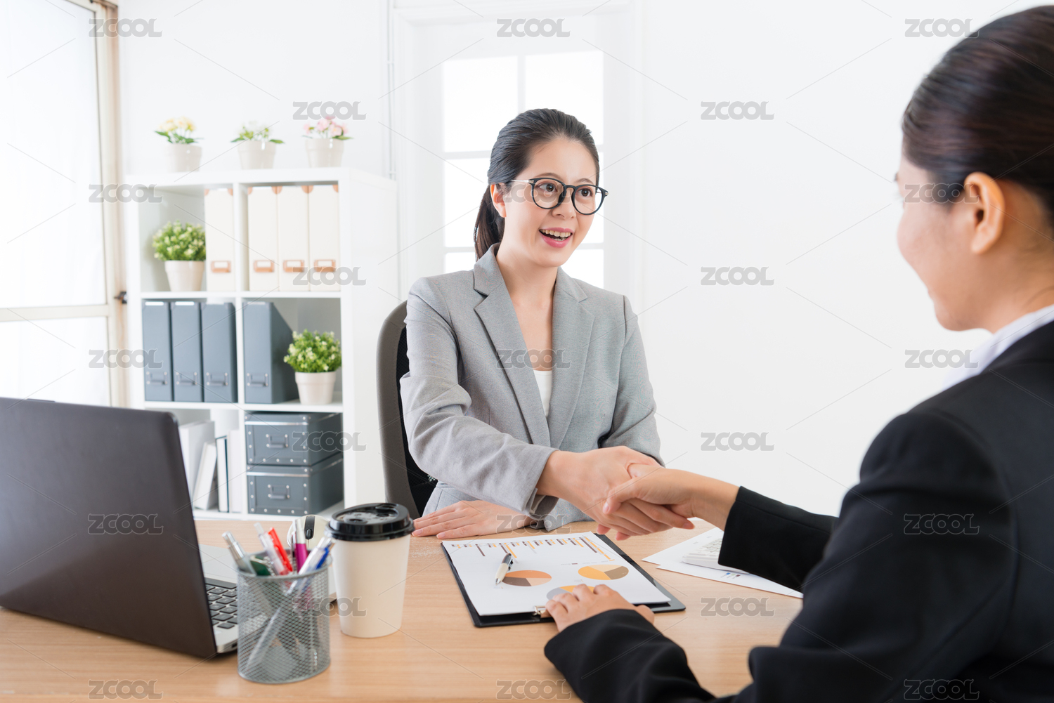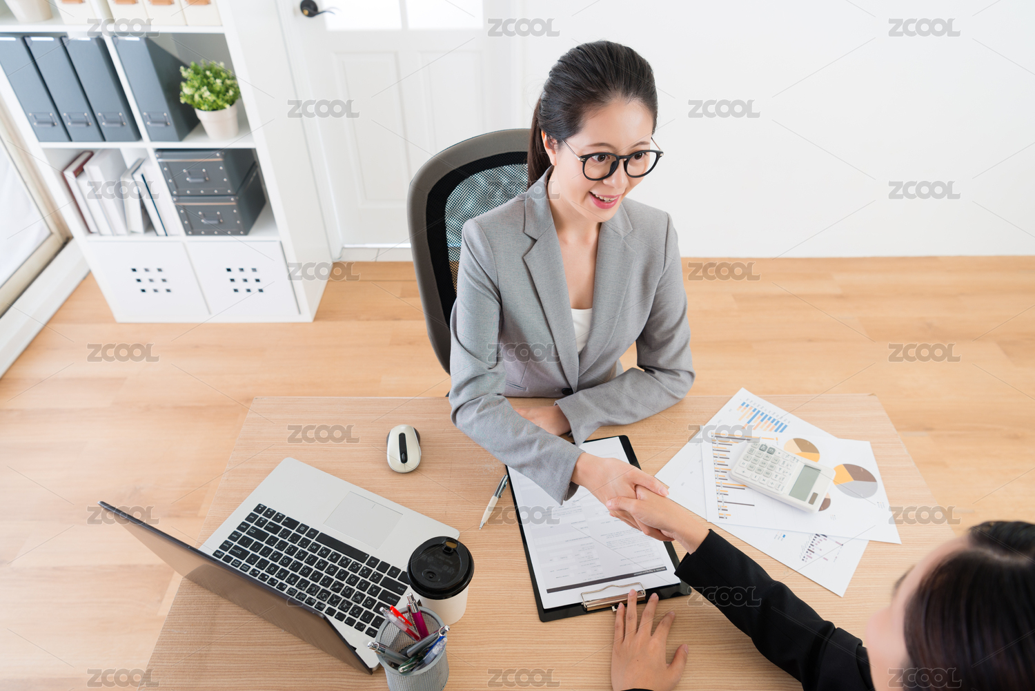 两个亚洲商界女性shking他们的手在桌子上。他们办公室的上述观点只是完成他们的会议的采访。一到工作的概念。