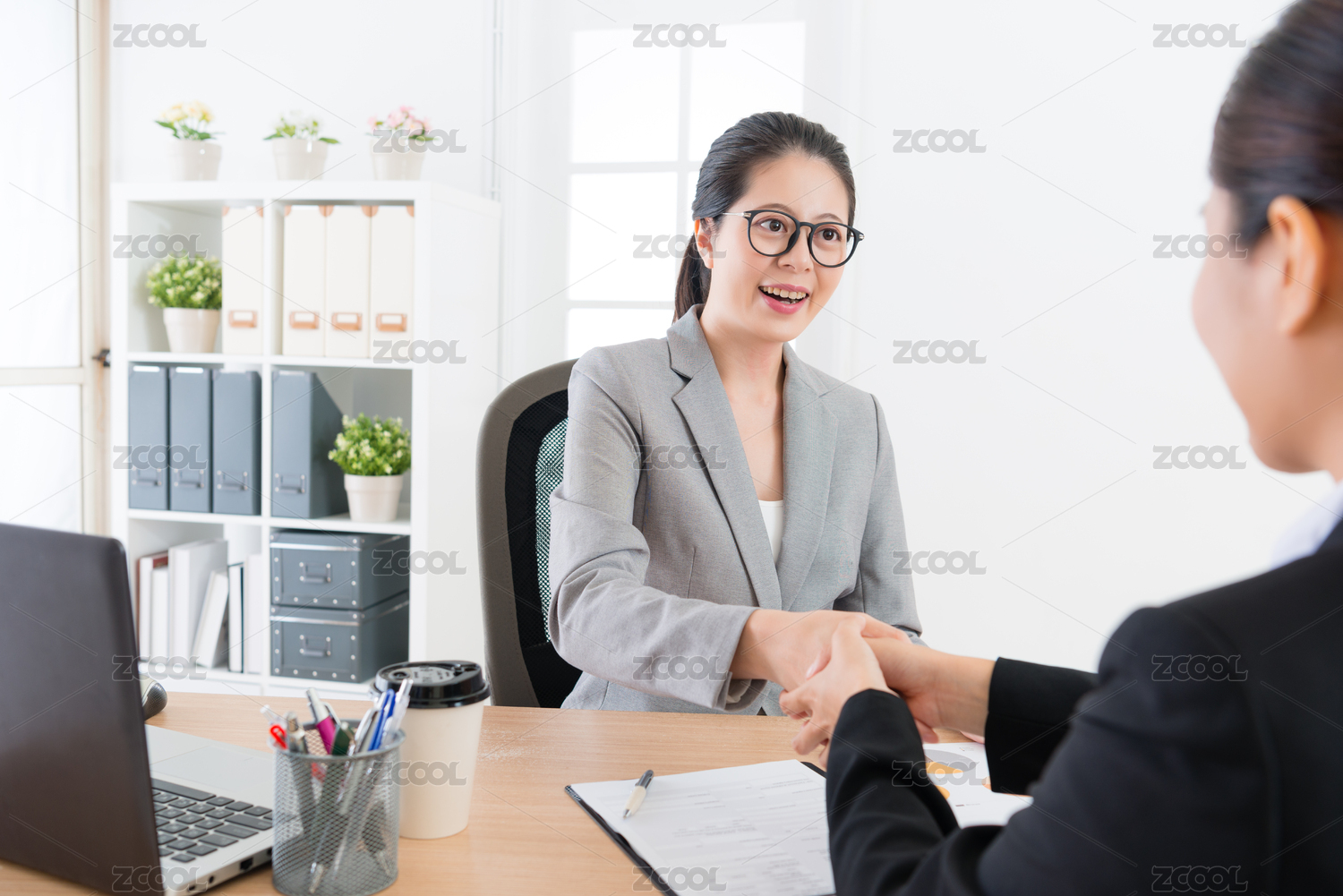 幸福的微笑上班族经理女人与年轻的业务销售的女孩握手时,他们达成了共识,并信守合同交易。