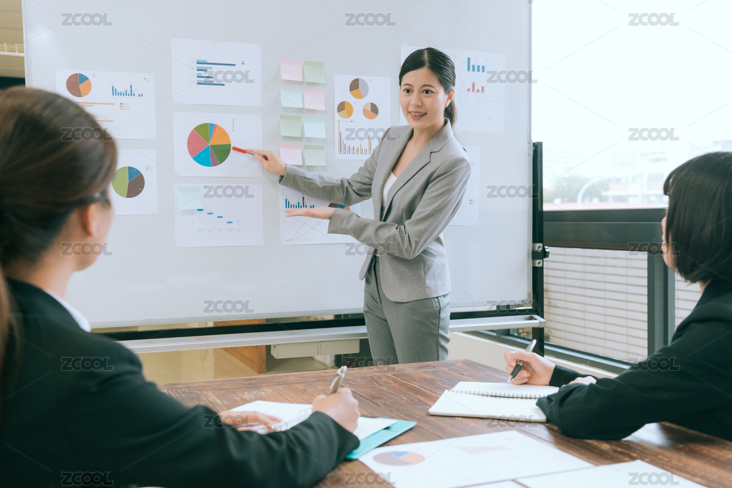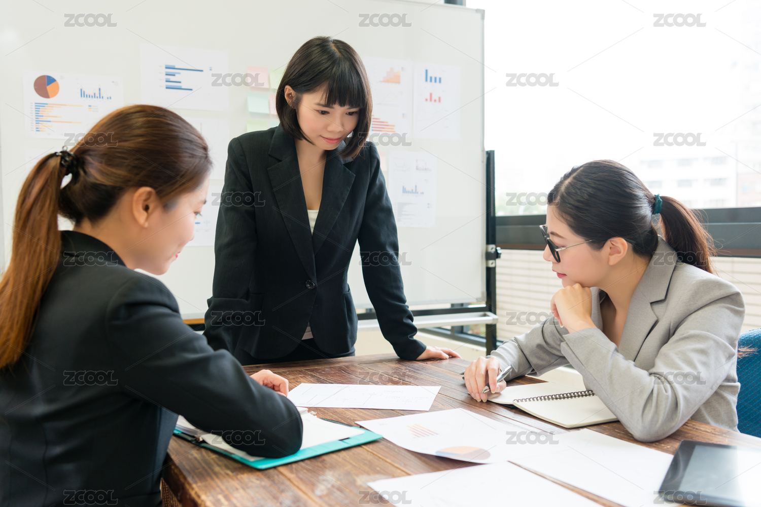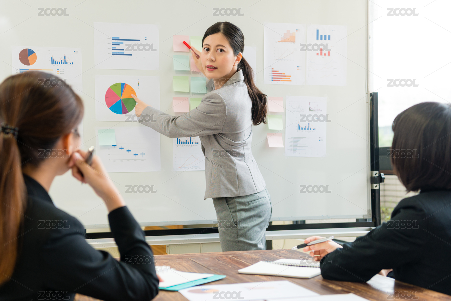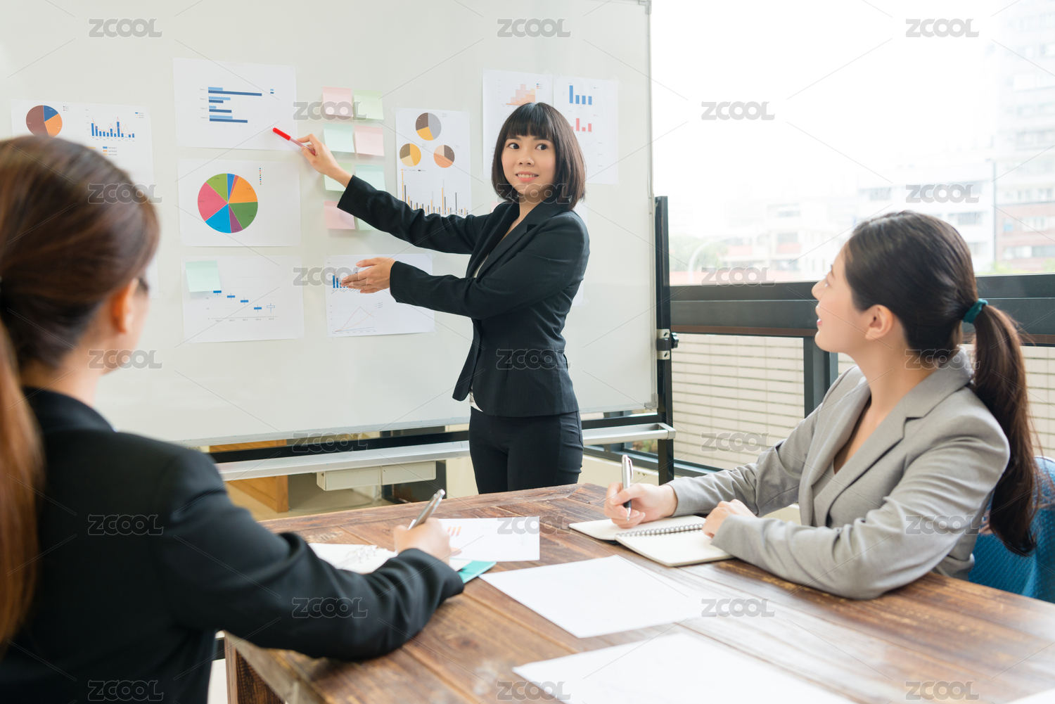 亚洲办事处的小姐展示和她的手在图explanning到其他的女商人穿着黑色正式西装,因为她看起来混乱。