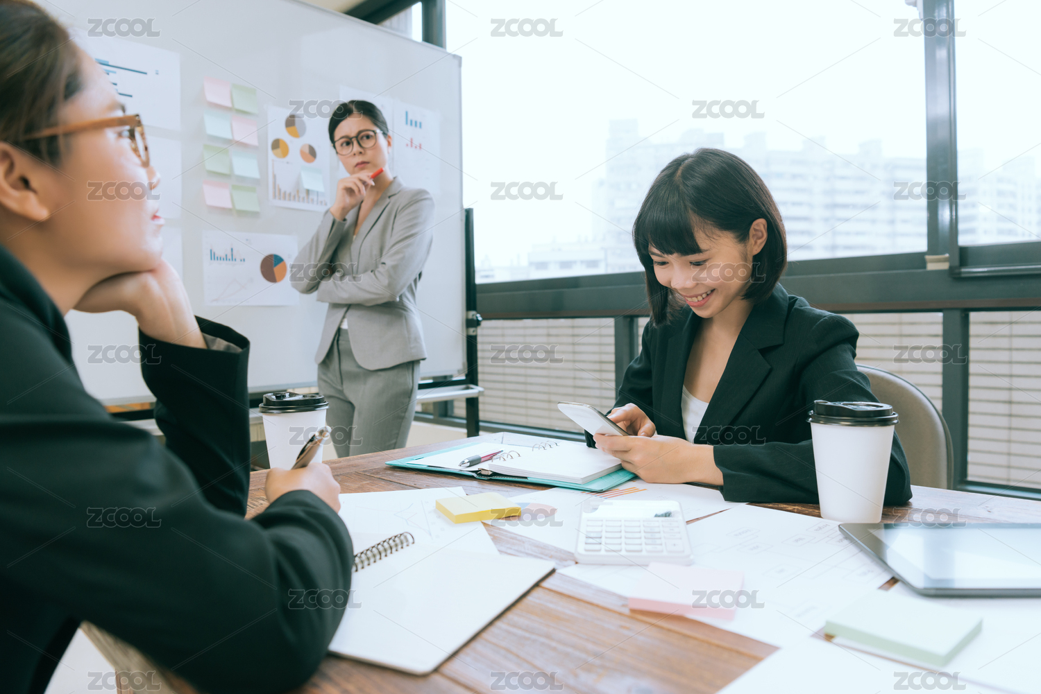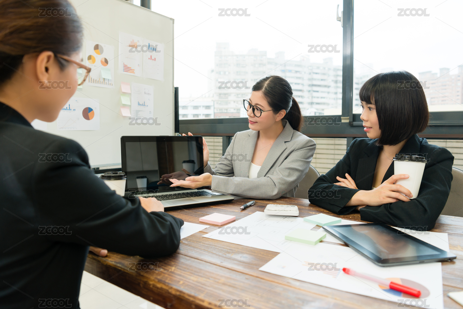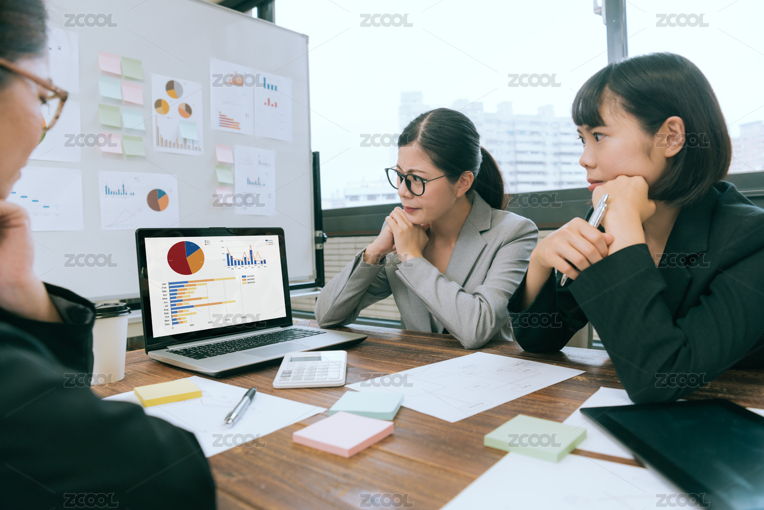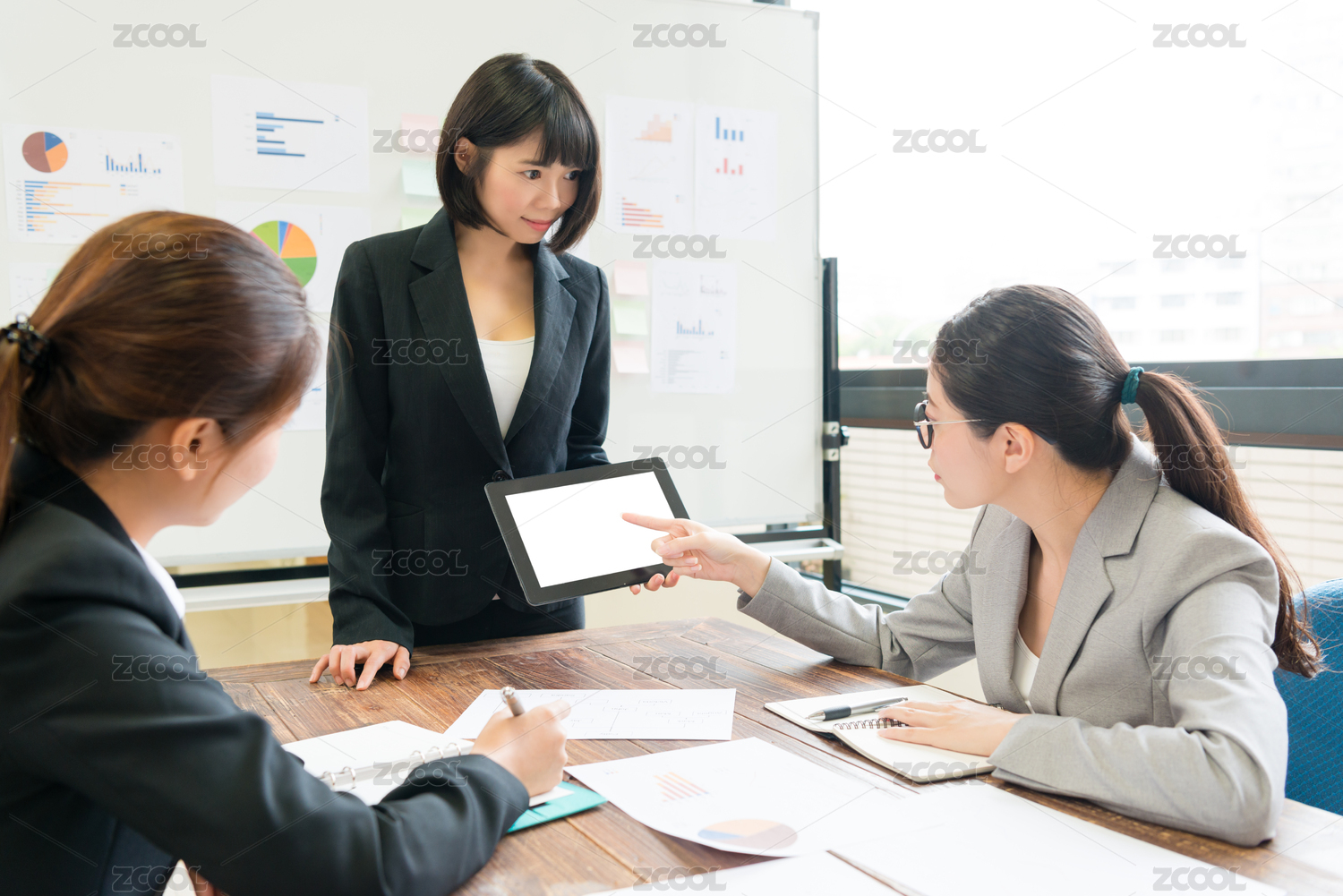 亚洲办事处的小姐展示和她的手在图explanning到其他的女商人穿着黑色正式西装,因为她看起来混乱。