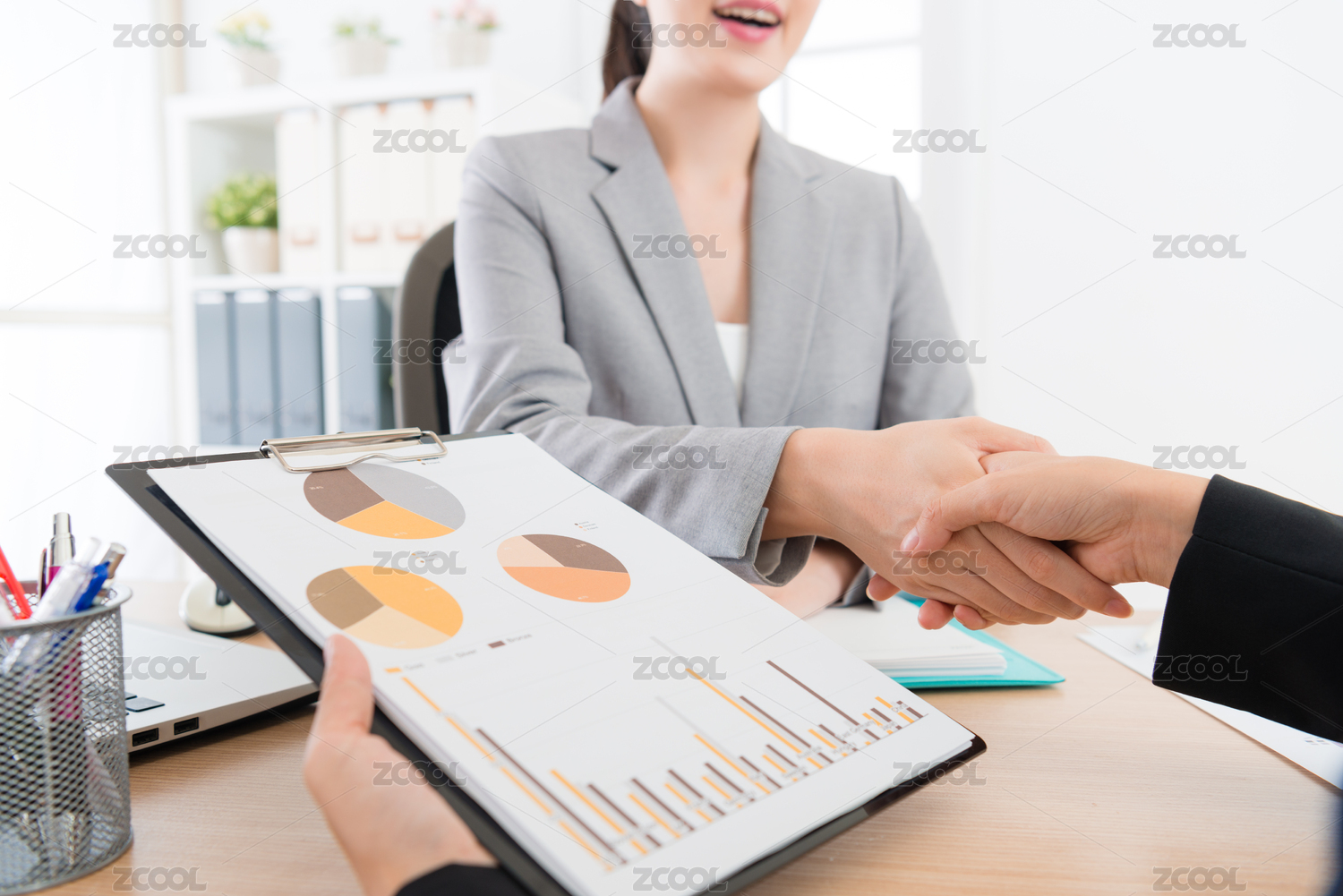 年轻漂亮的商业销售的女孩成功说服她加盟客户合作公司情况和握手庆祝。