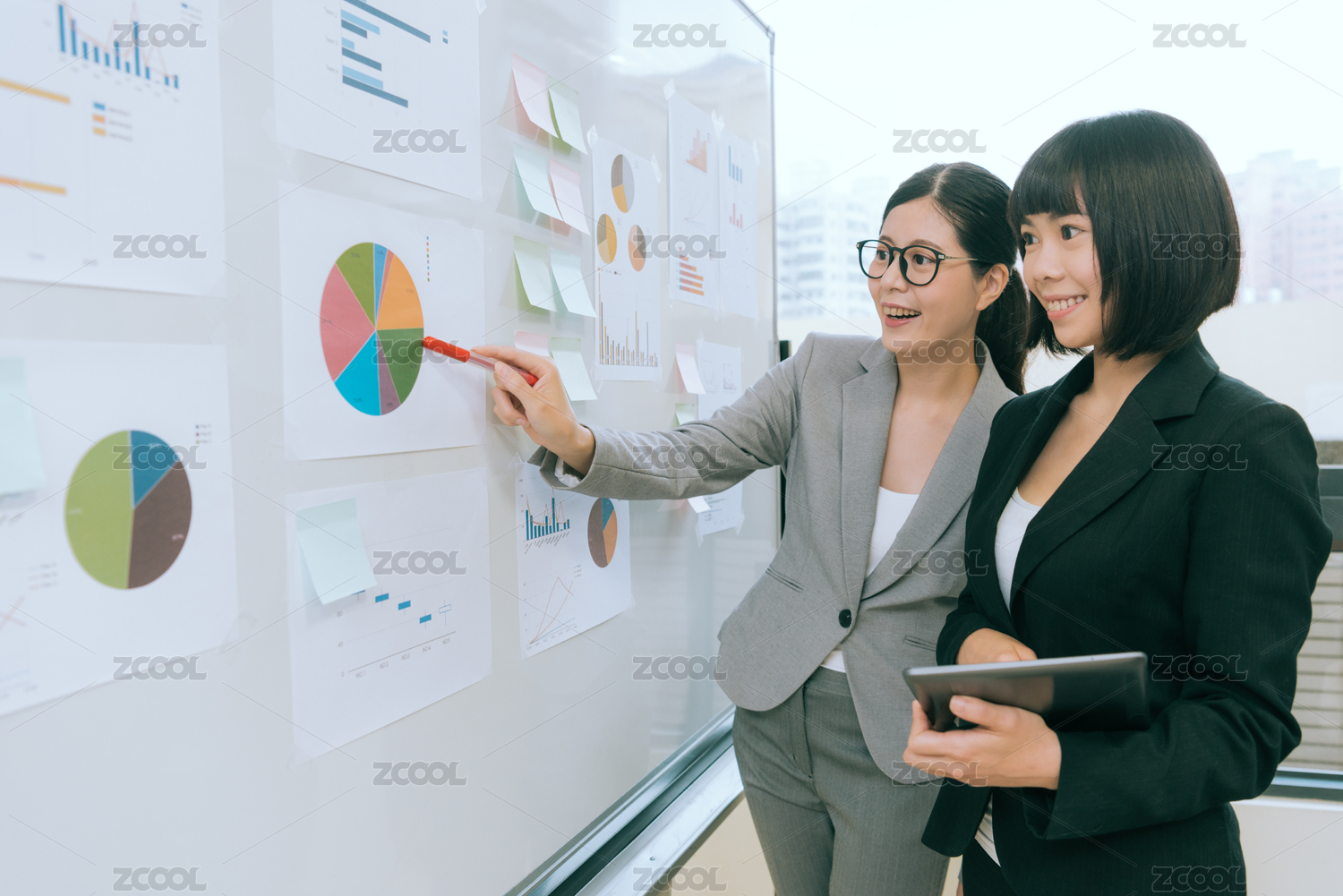 幸福美丽的女上班族在寻找计划在白板图形和手持移动数字平板电脑一起工作的讨论结论。
