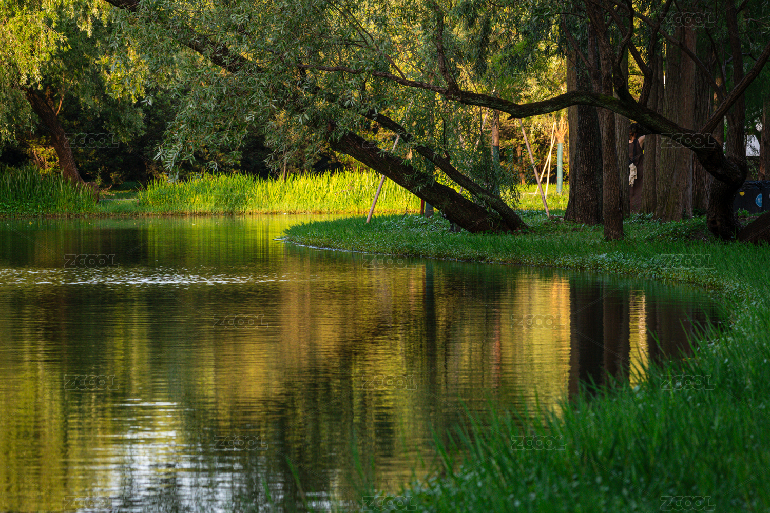 暮色浸染上海共青森林公园,湖面如镜映夏绿