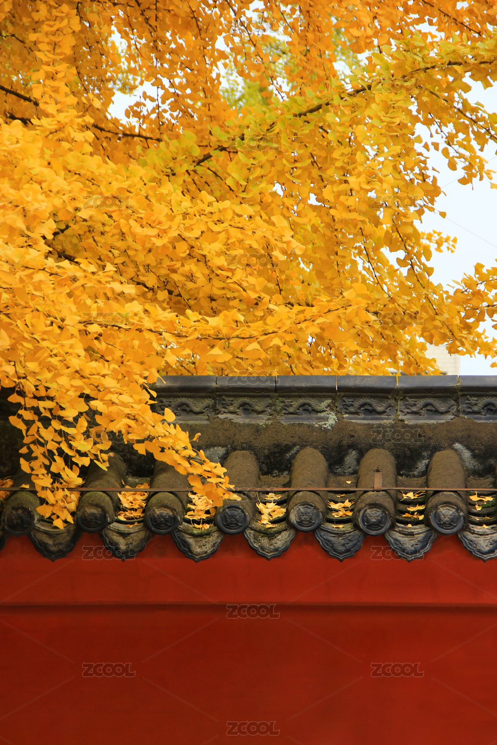山东济南淌豆寺秋天黄色千年银杏树叶子金黄