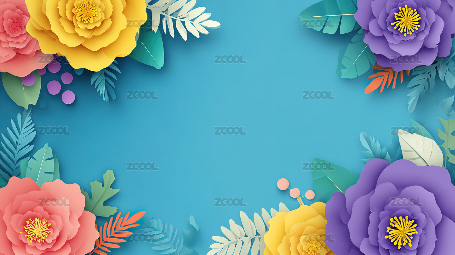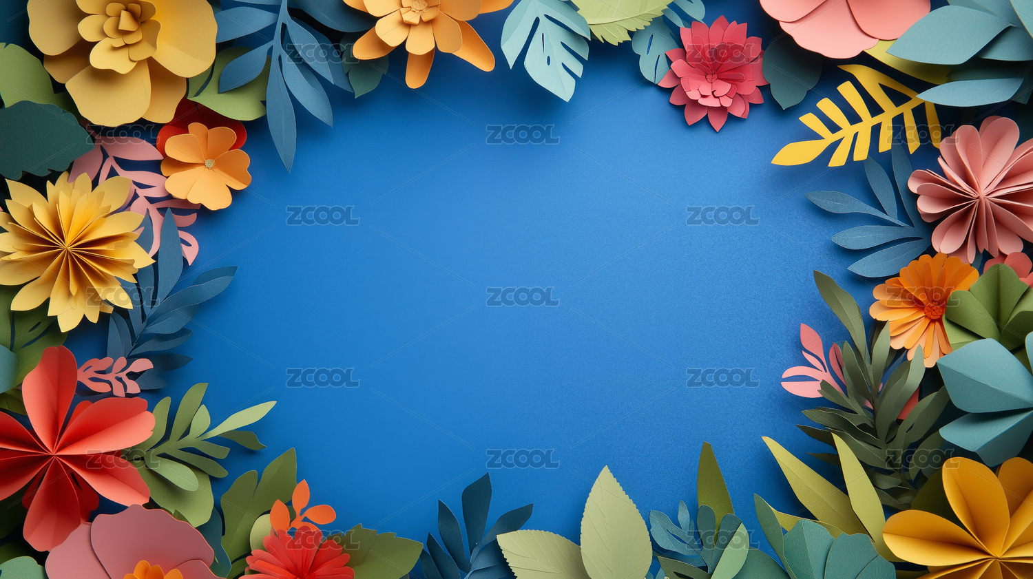 3D蓝色剪纸风格花朵叶子装饰插画背景