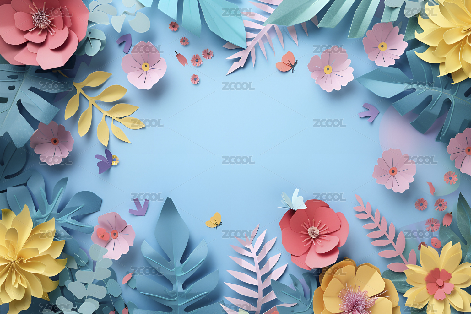 粉色蓝色渐变背景上的纸艺花卉装饰