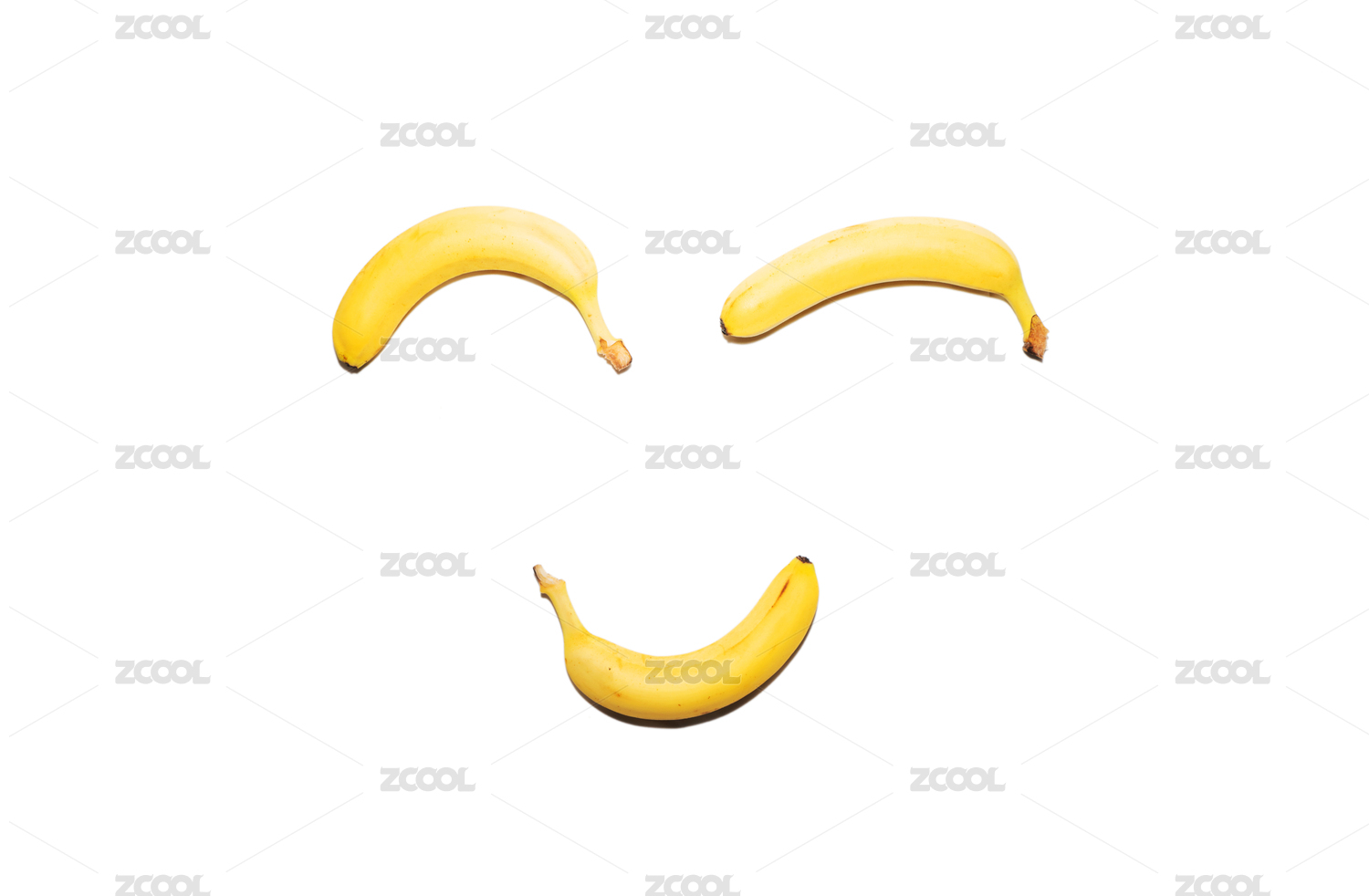 白色背景下棚拍用香蕉摆出了笑脸的形状
