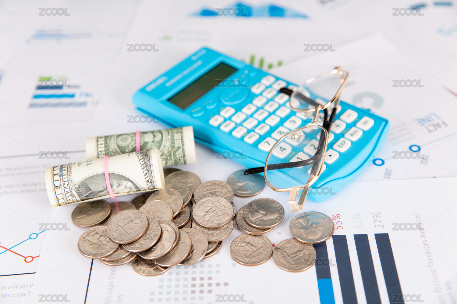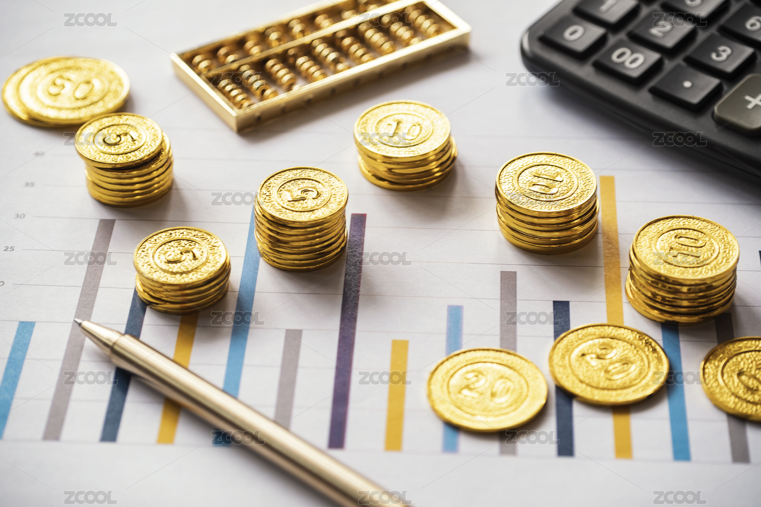 桌面上放着计算器和美美金金币硬币报表图表报告金融经济行情分析概念