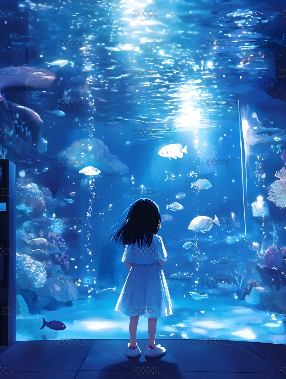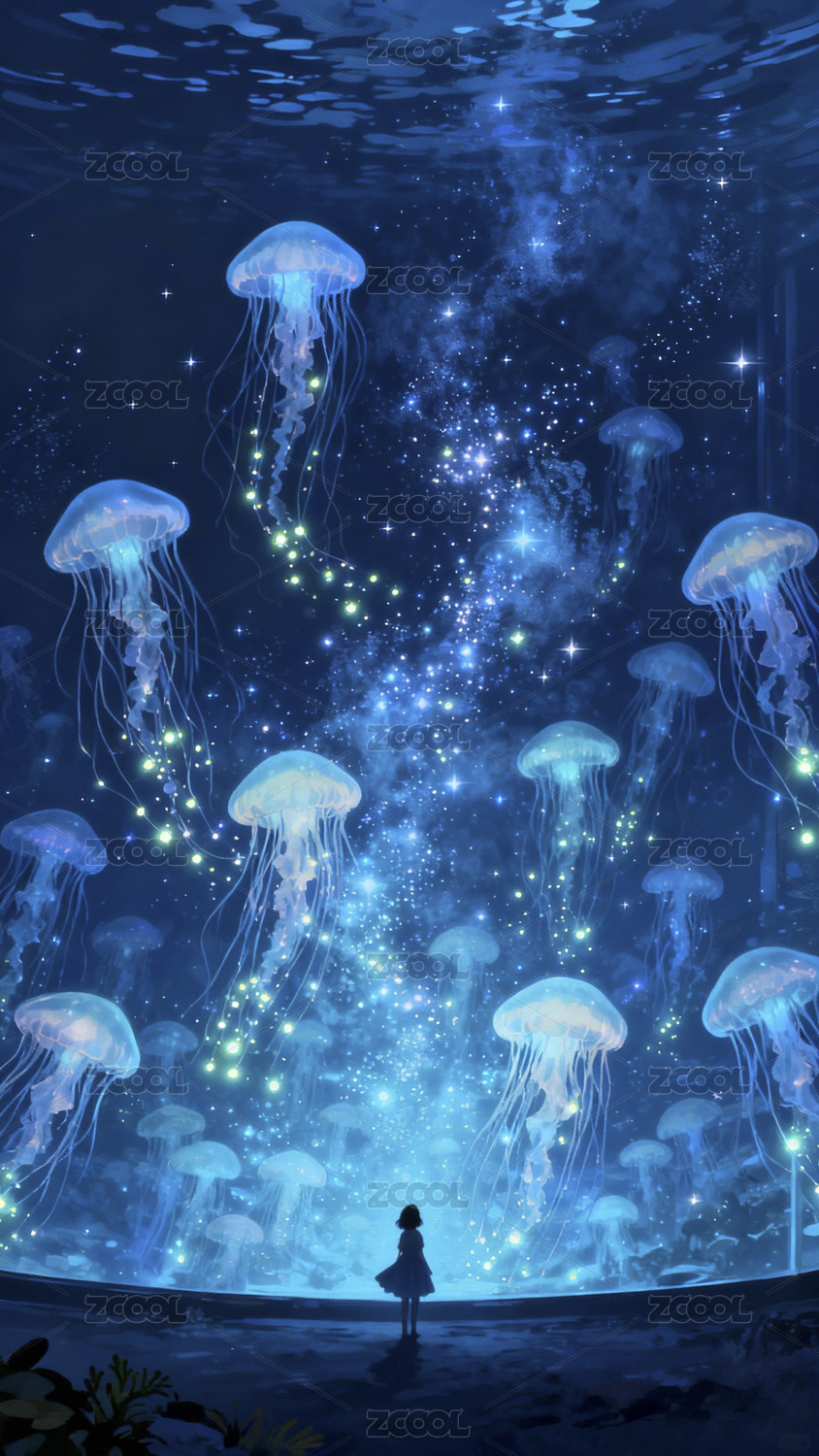 蓝色色调女孩站在阶梯上看水母梦幻场景