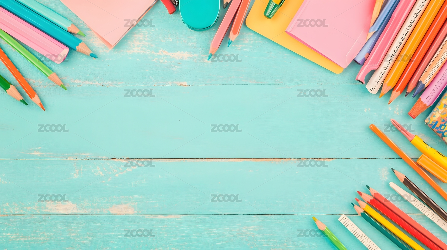 白底上随意散落的几根彩色铅笔回形针与票夹