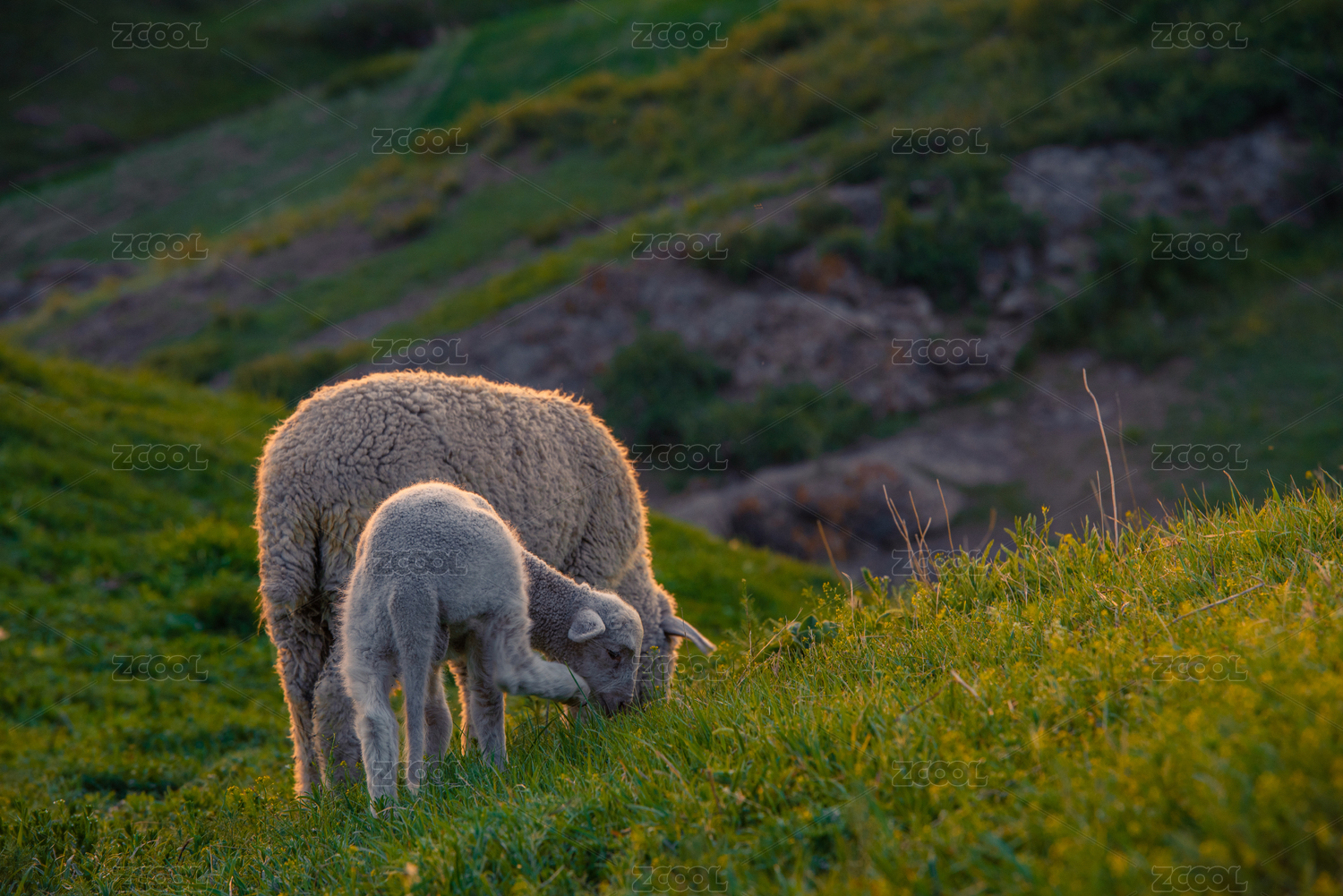 夕阳山坡上低头吃草的羊儿
