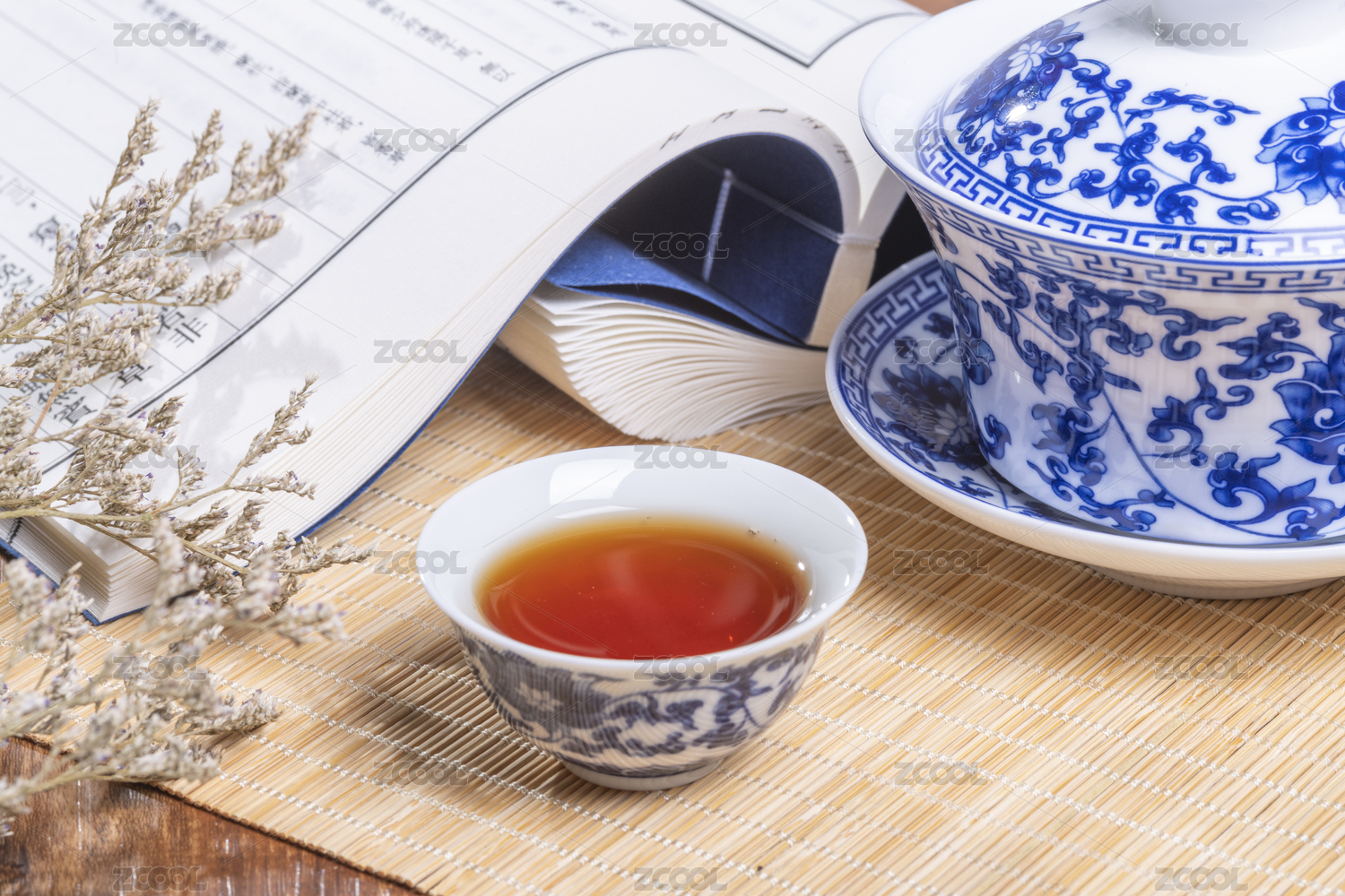 蓝色背景和红茶杯