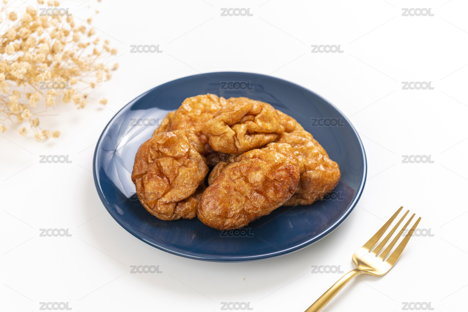 炸面筋,面筋,水面筋,油面筋,烤麸,植物蛋白,一盘,一碟,金色叉子,面粉