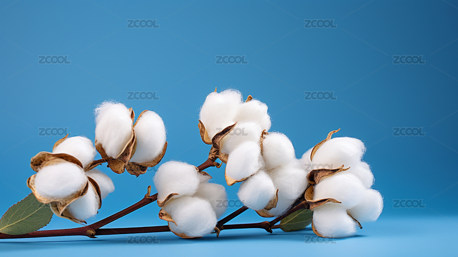 蓝底棉花枝上白色棉桃与棕萼特写