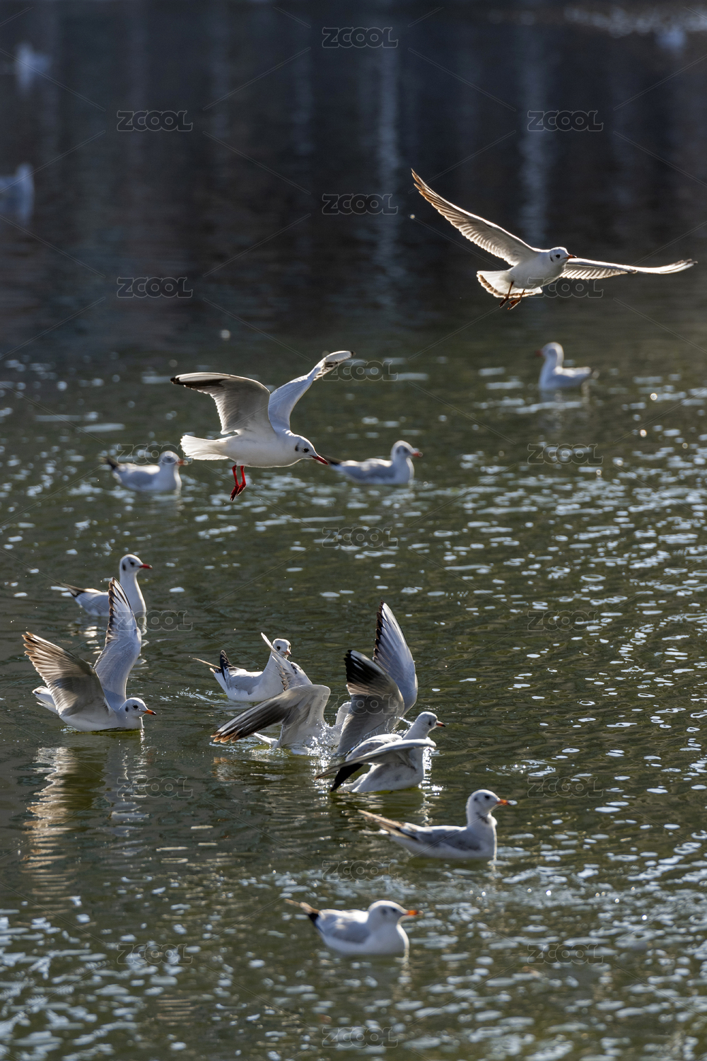 红嘴海鸥在水面上自由飞翔追逐觅食嬉戏