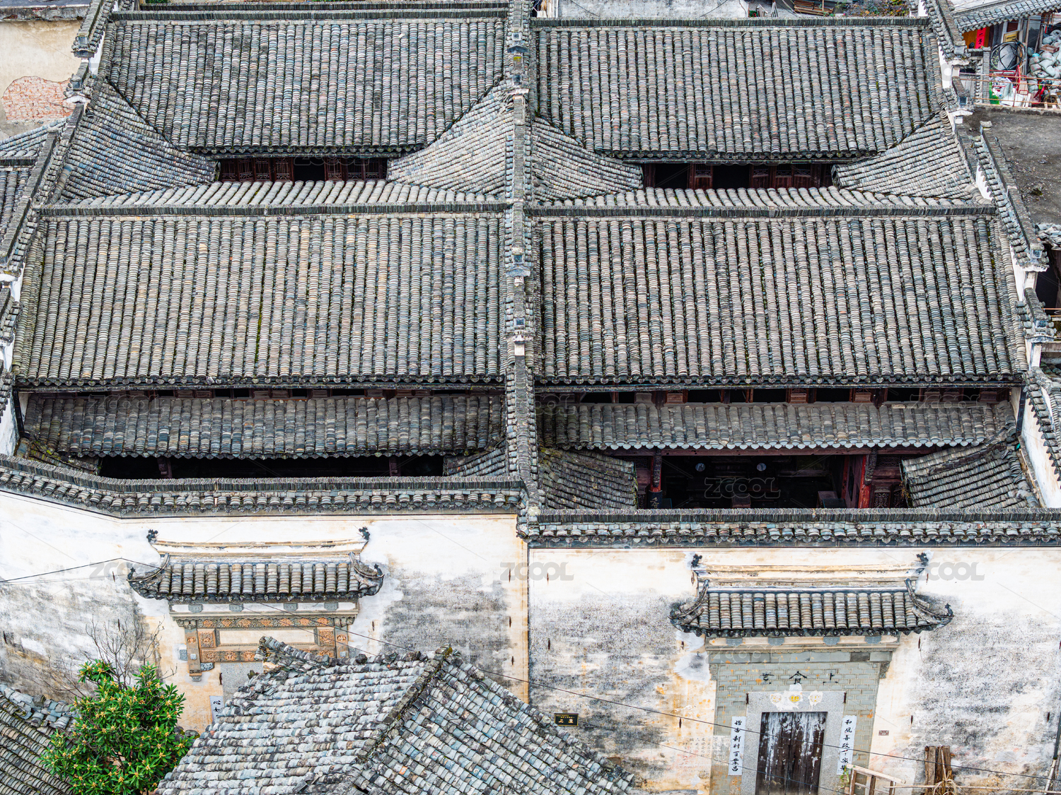 秋天时节乡村瓦屋和金灿灿的银杏树