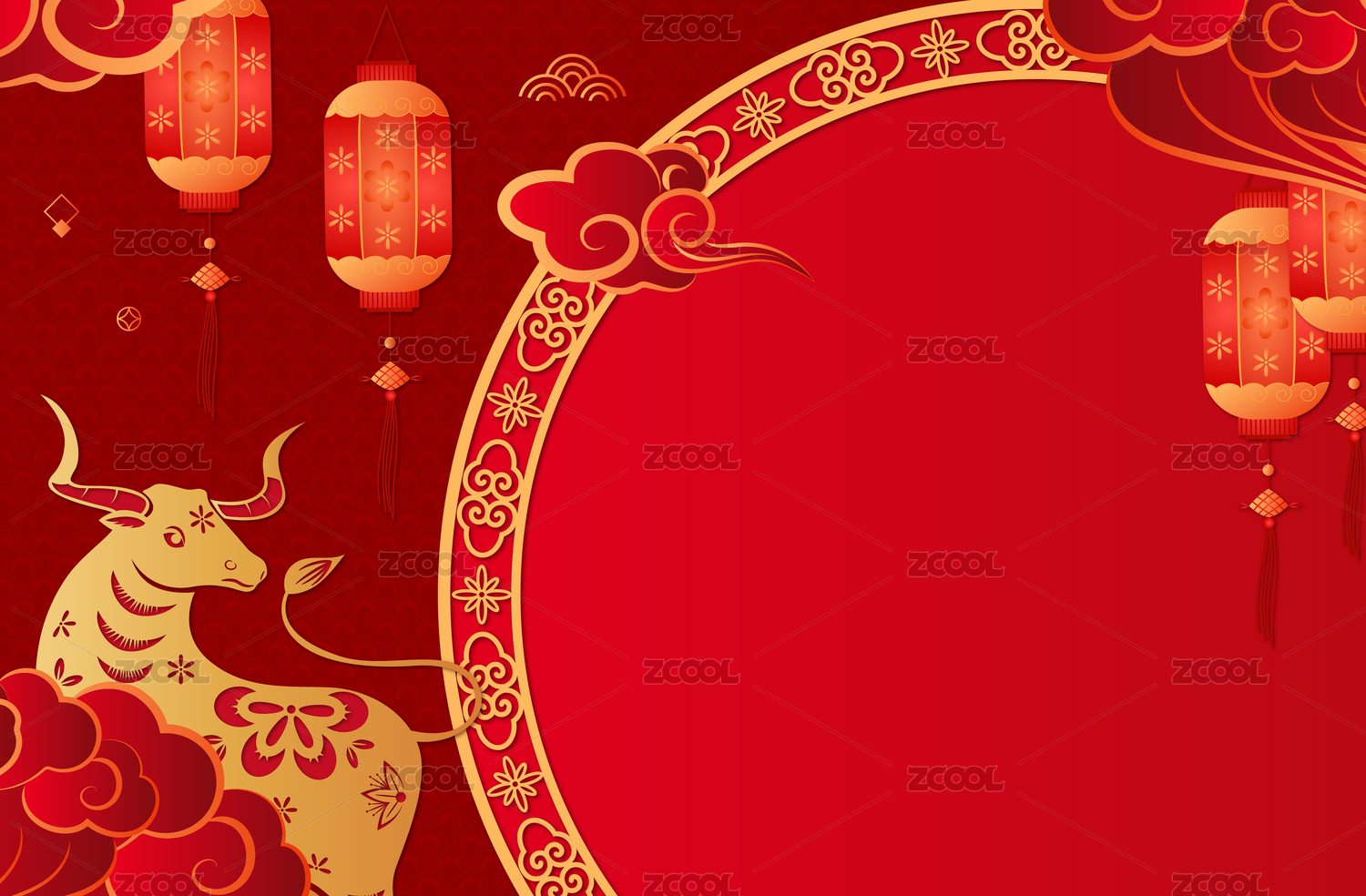 牛年新年中国风剪纸牛与云纹灯笼背景