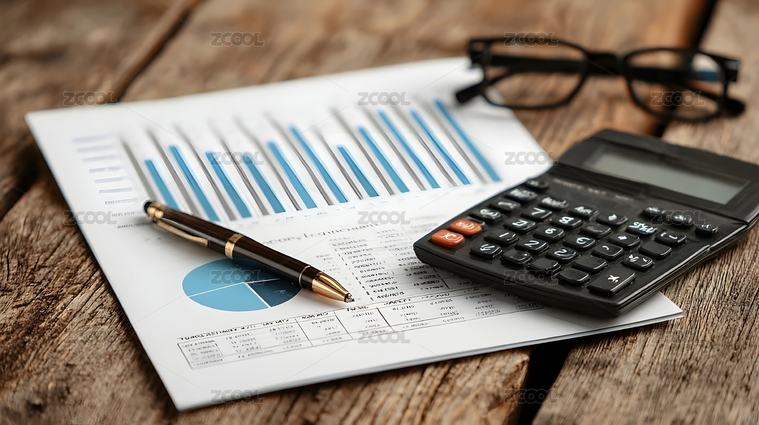 金融经济数据增长概念——放在财务数据报表上的计算器、钢笔和放大镜