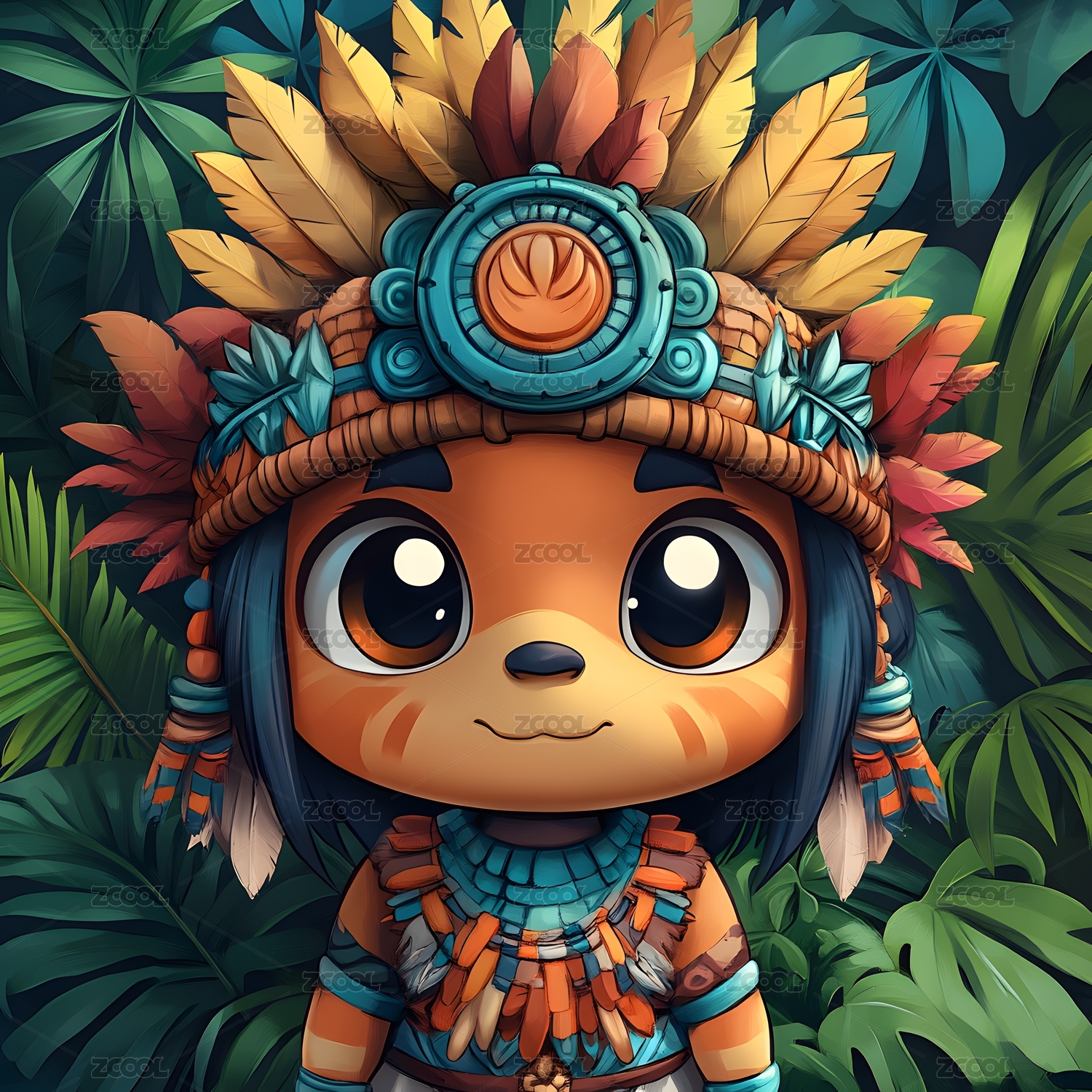 卡通部落风格戴着羽冠图腾的小孩头像壁纸