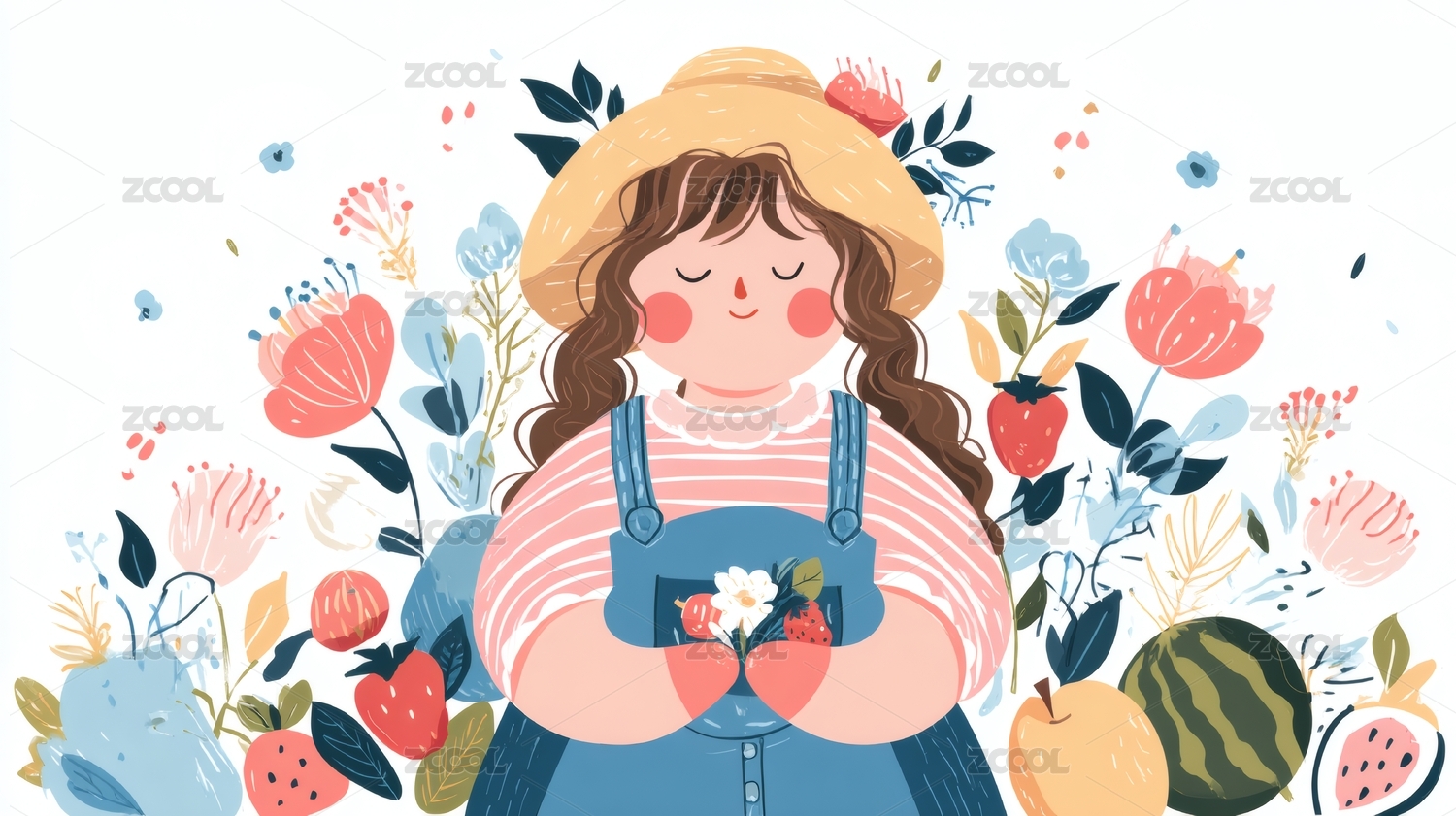 柠檬花朵绿叶背景的可爱女孩形象插画