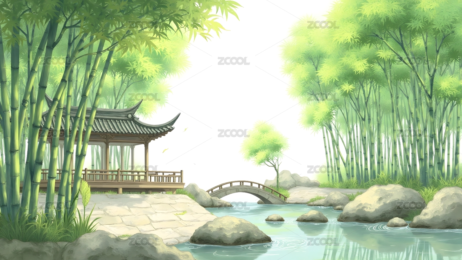 竹林小亭与流水拱桥