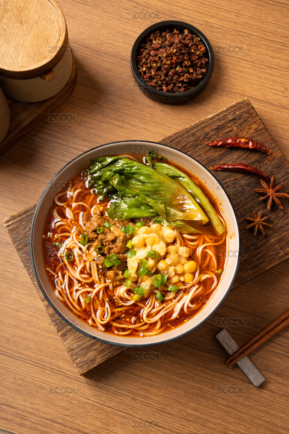 棕色桌面上放着一碗红油肉末米线