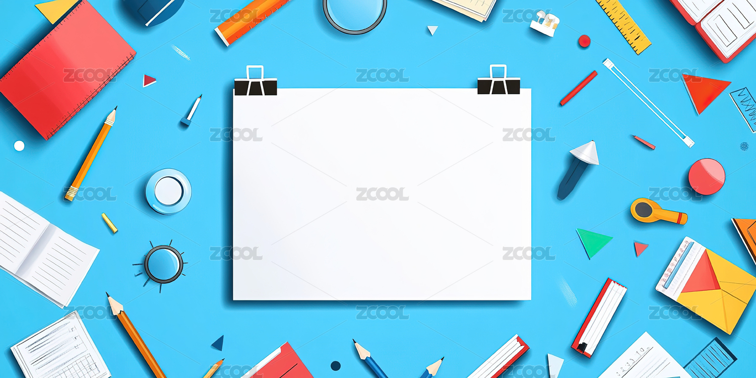 正上方蓝色背景下的办公用品照片