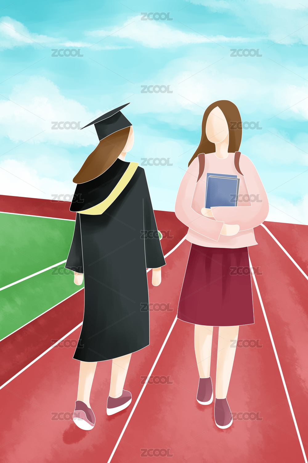 毕业季穿着毕业服的女生从操场路过竖版插画