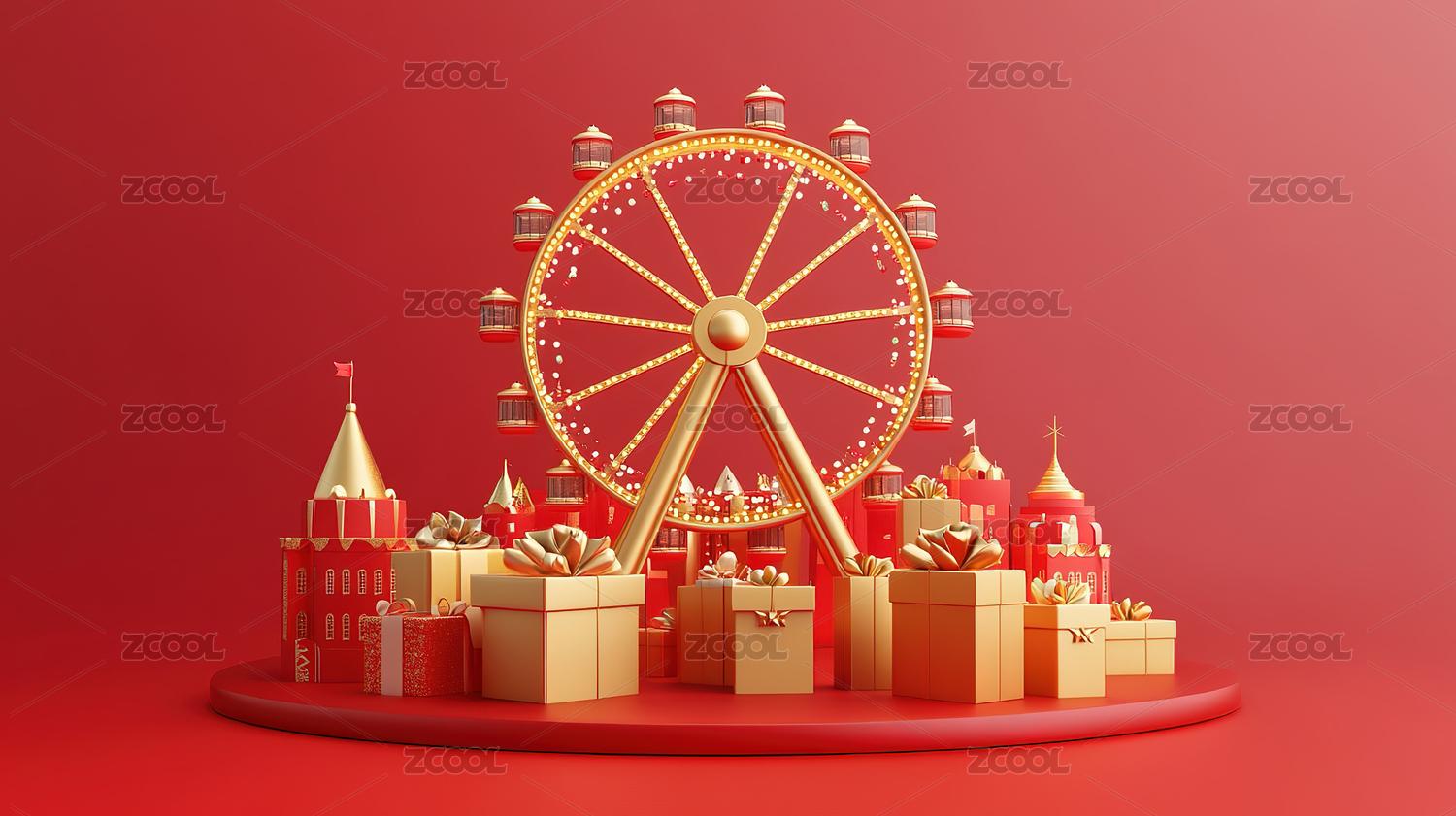 电商三维舞台场景城市背景红金摩天轮热气球节日背景