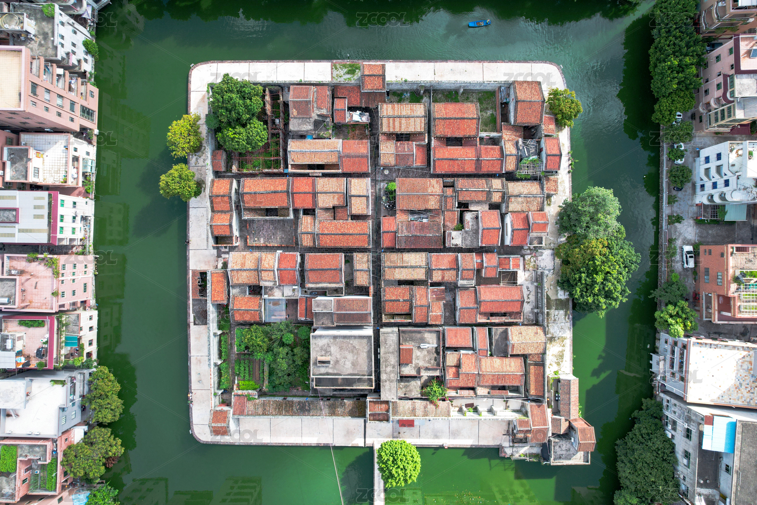 中国广东东莞虎门古建筑逆水流龟村堡航拍景观