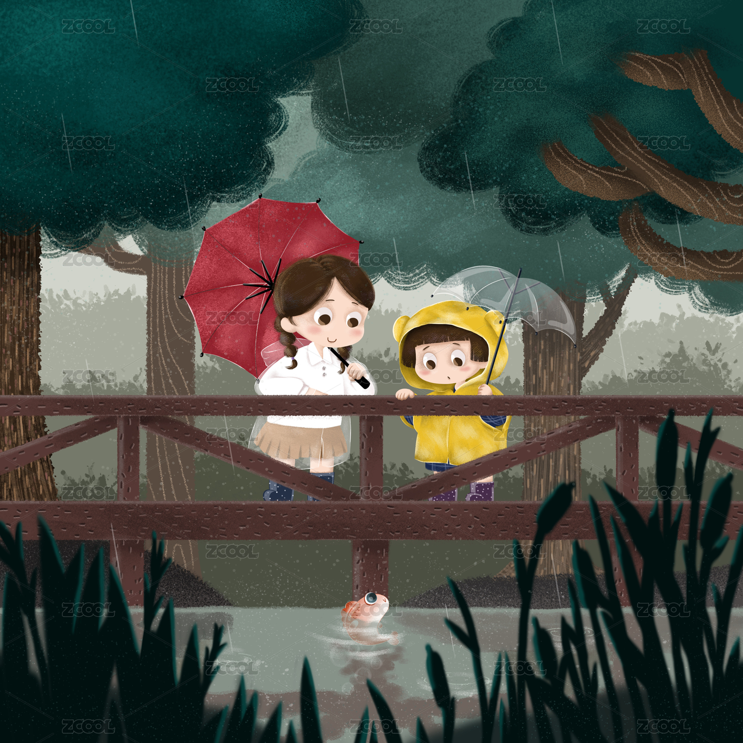 小孩,雨季,植物,森林,冒险,节气,插画,插图,绿色,树林