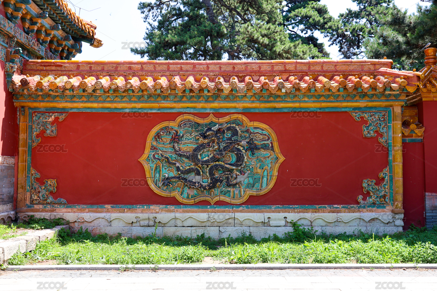故宫红墙接黄琉璃瓦影壁龙纹浮雕