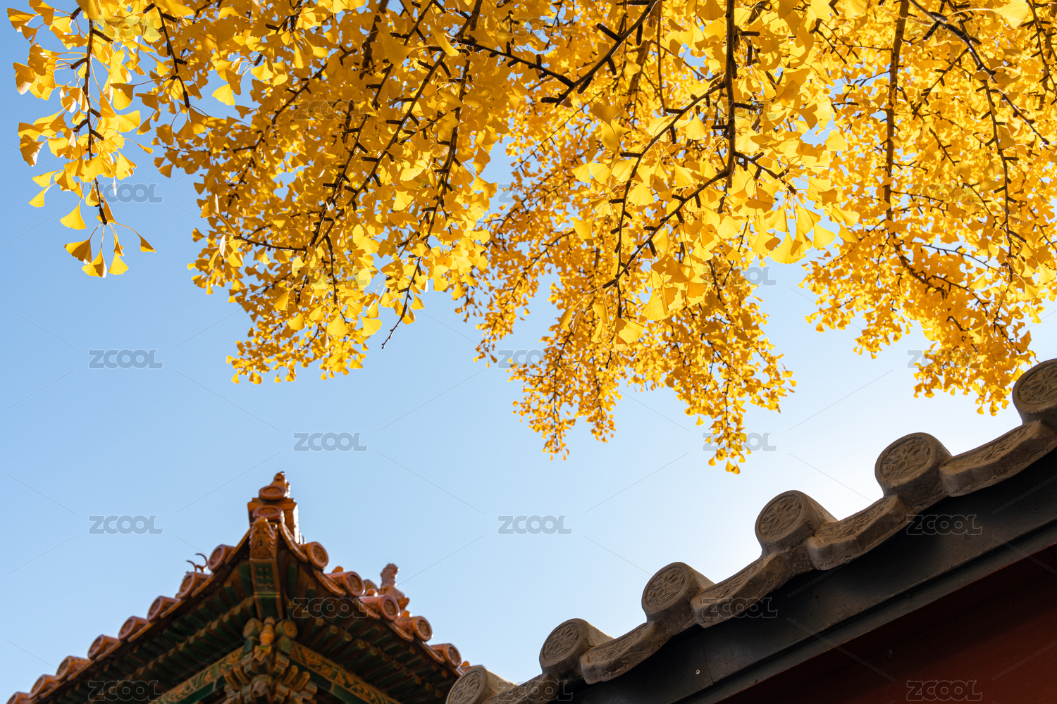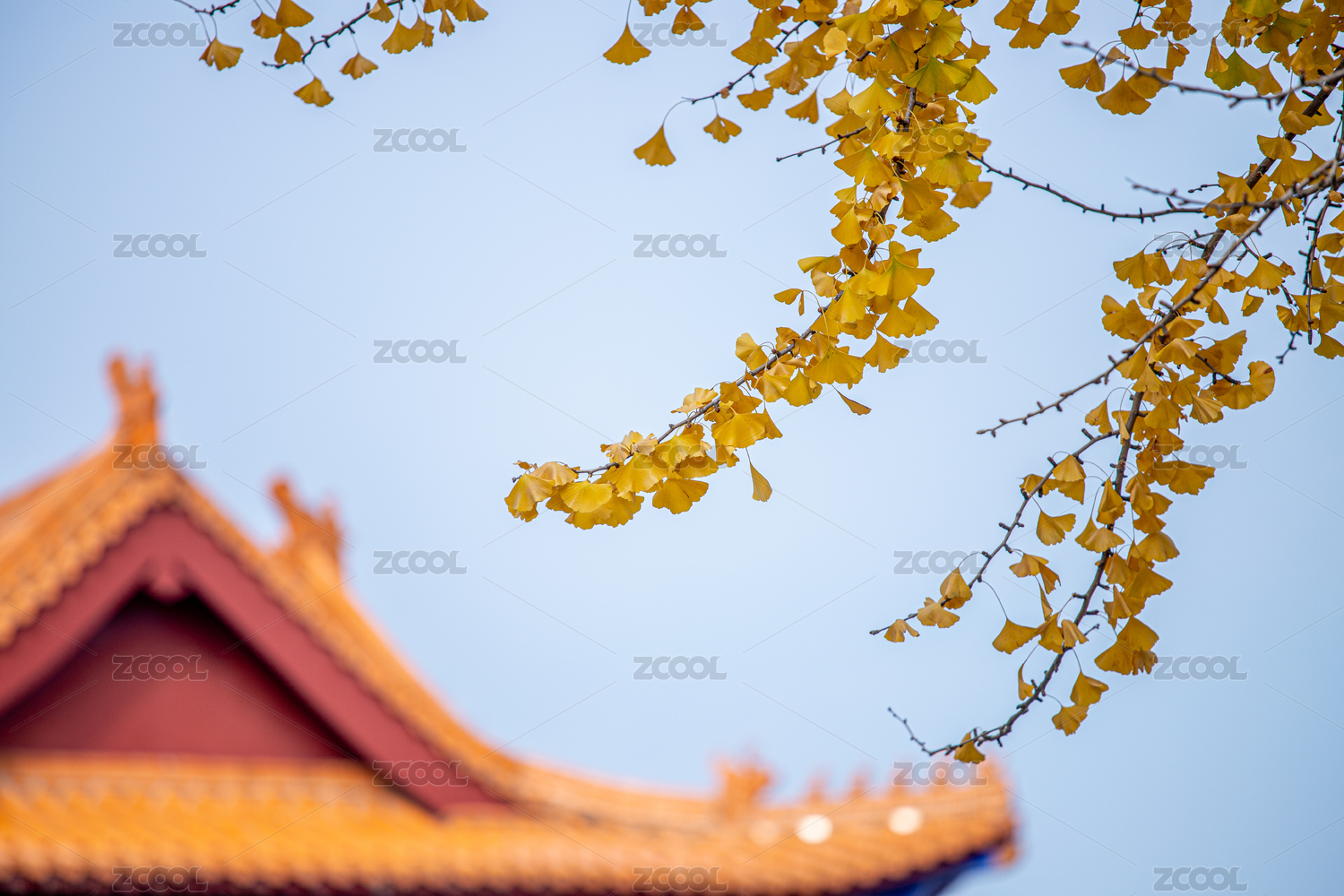 故宫屋檐银杏秋景