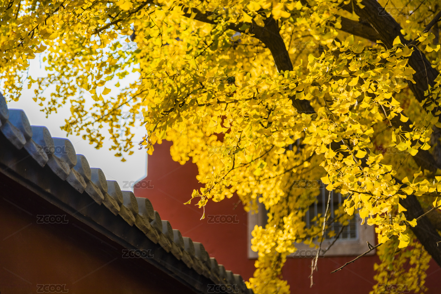 秋天寺庙银杏、黄墙、中式建筑特色