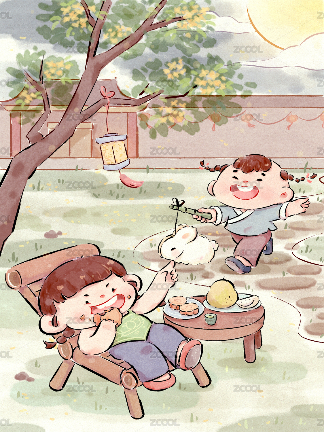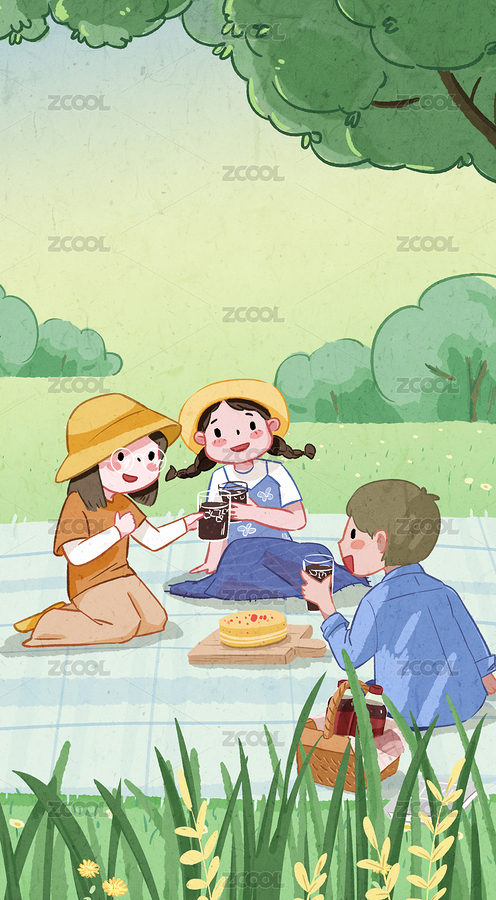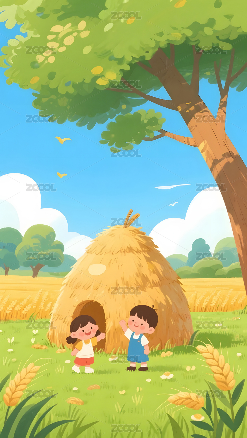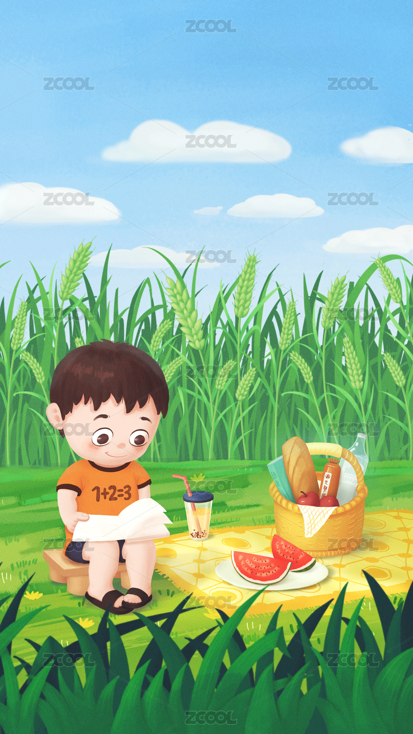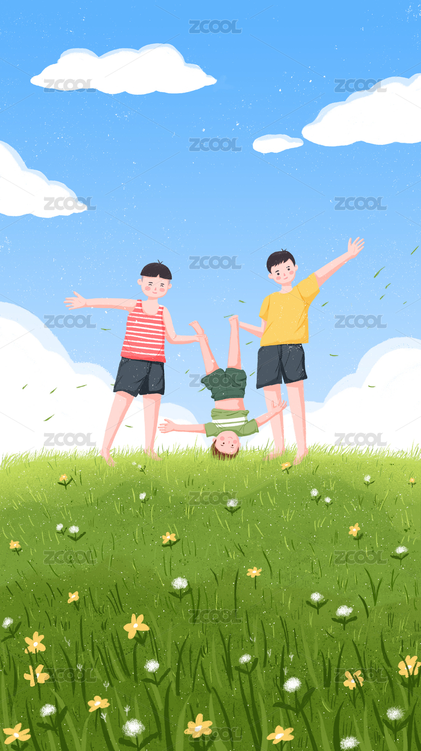 惊蛰节气插画 男孩女孩在草丛中和蜗牛玩耍