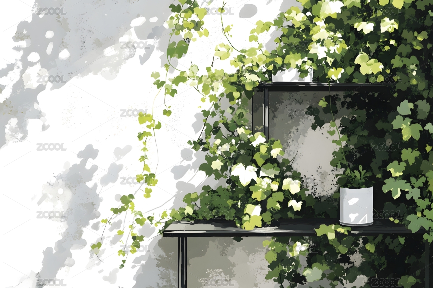 自然,淡彩,藤蔓,绿叶,石墙,水彩,植物,灰色,绿色,生长