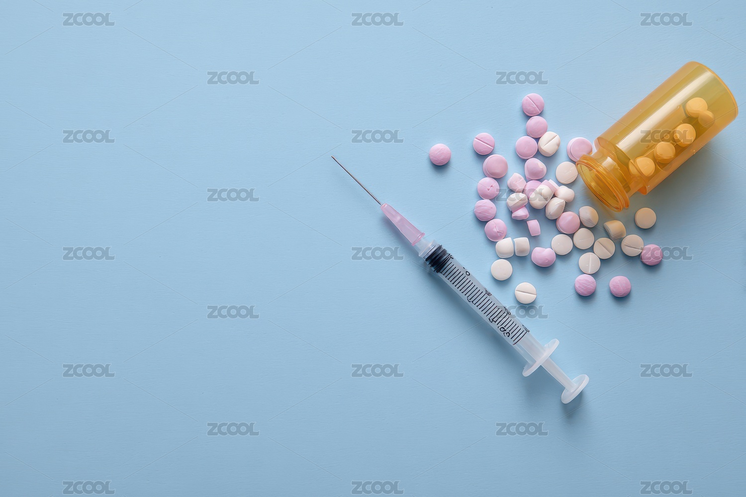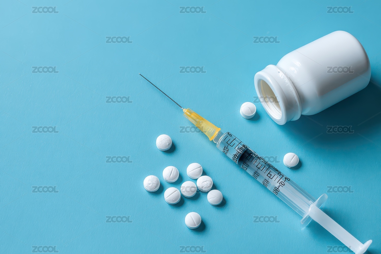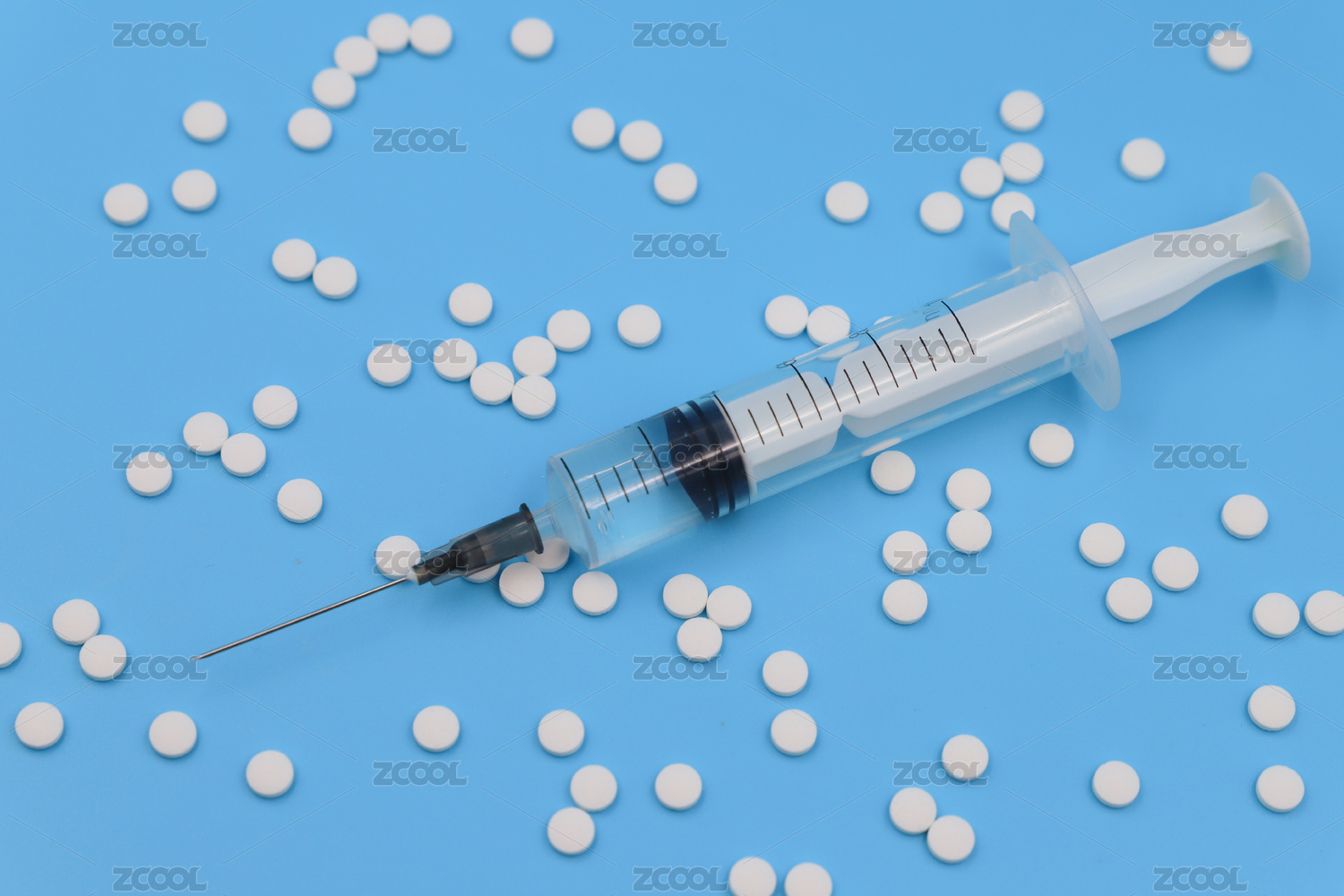 一次性注射器摆放在蓝色背景前旁边放有体温计药片