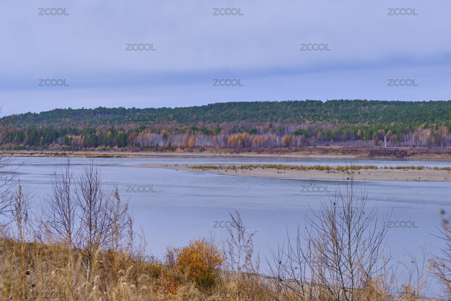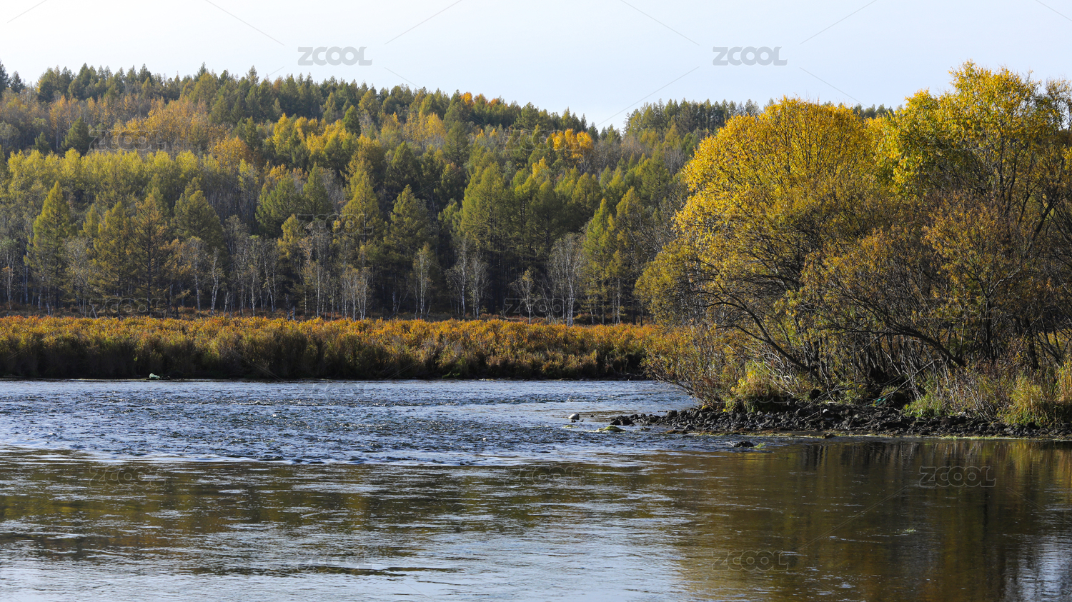 内蒙古阿尔山秋天里的河流和金黄色森林风景