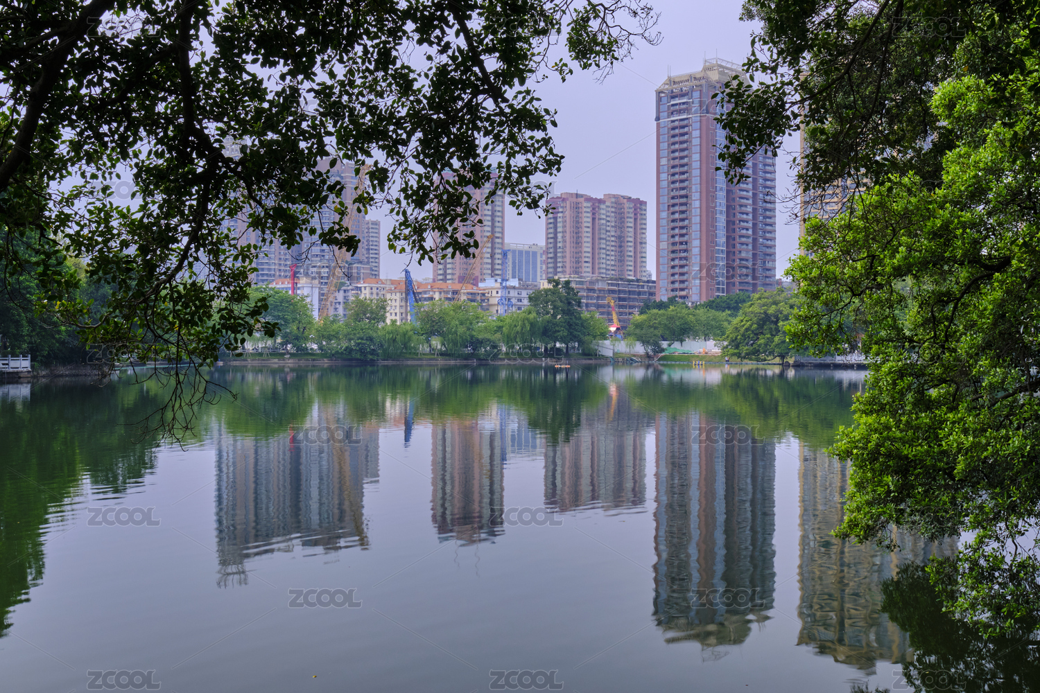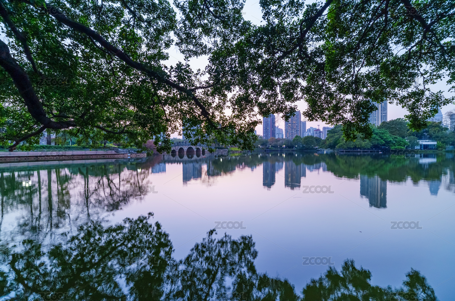 广西南宁市人民公园湖泊树林与夕阳晚霞