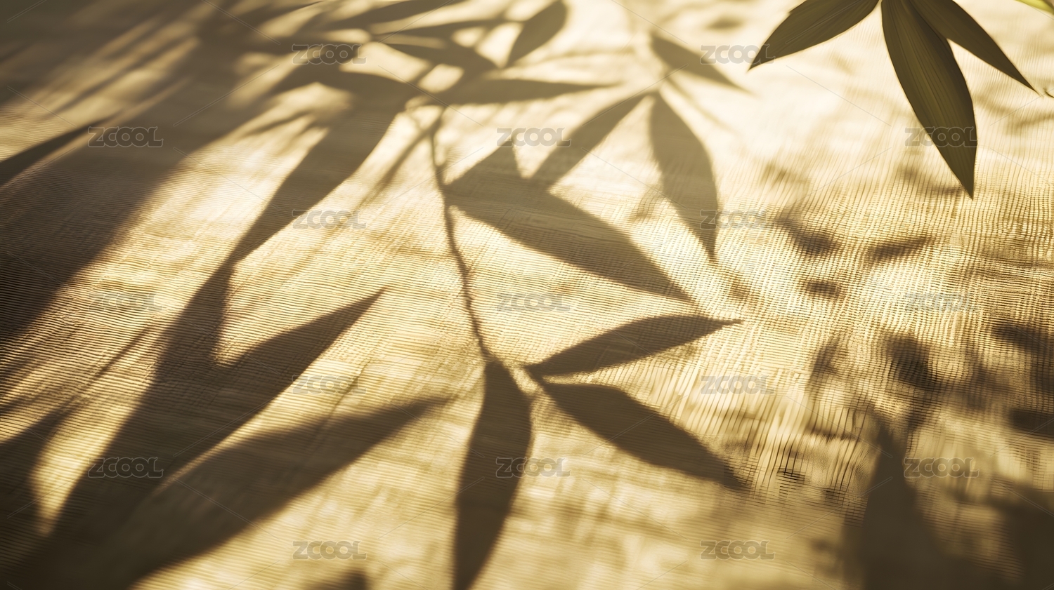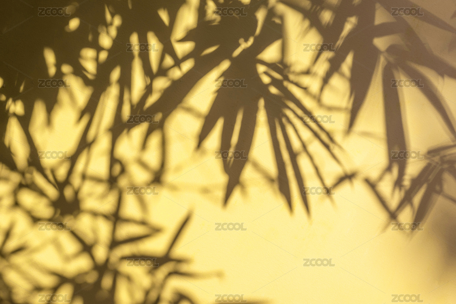 阳光下黄色墙壁上斑驳的竹叶影子和竹林