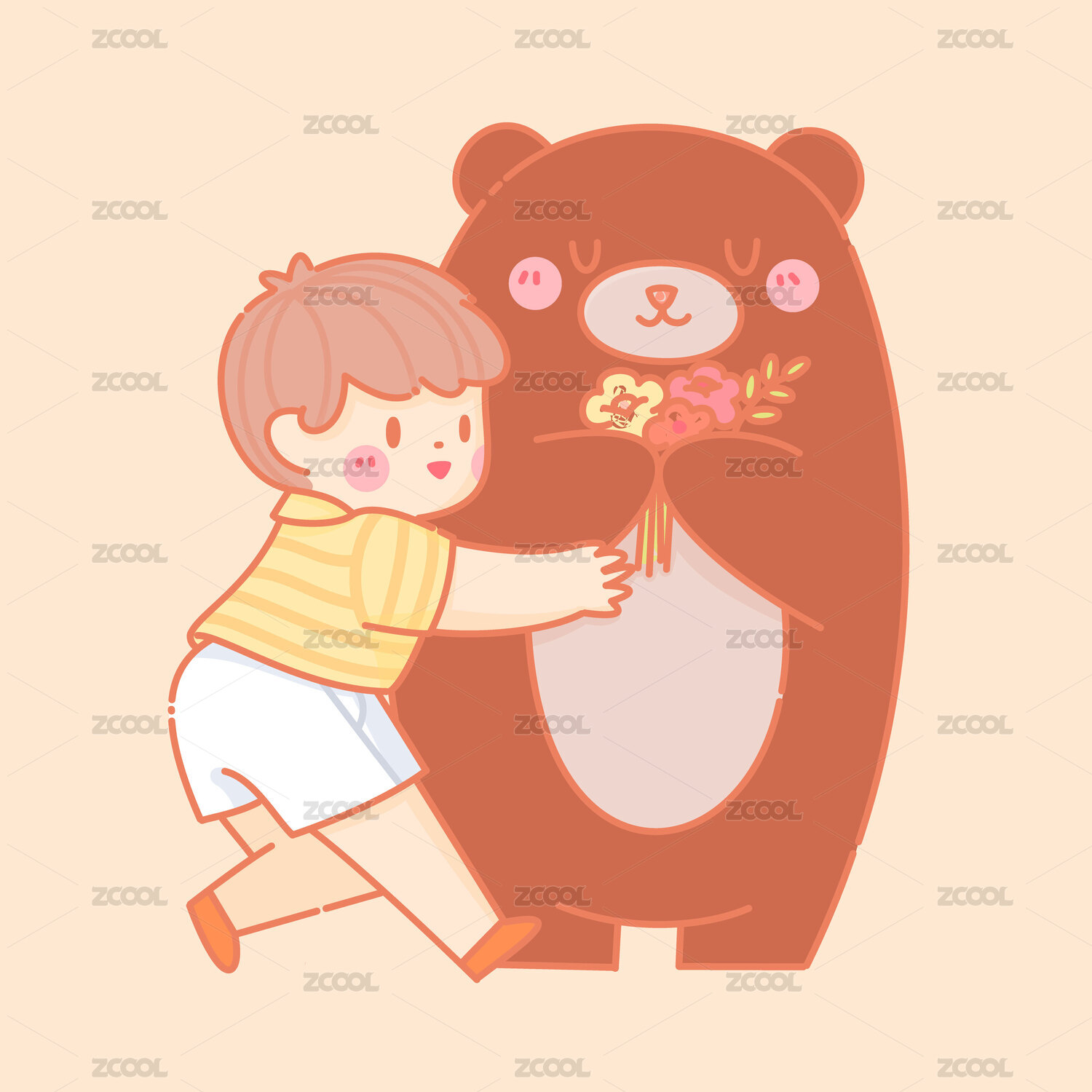 儿童节插画,天空中的太阳、小女孩和泰迪熊
