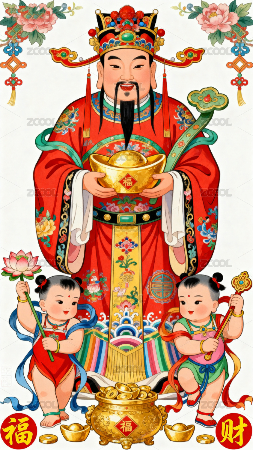 财神爷怀抱孩童寓意吉祥