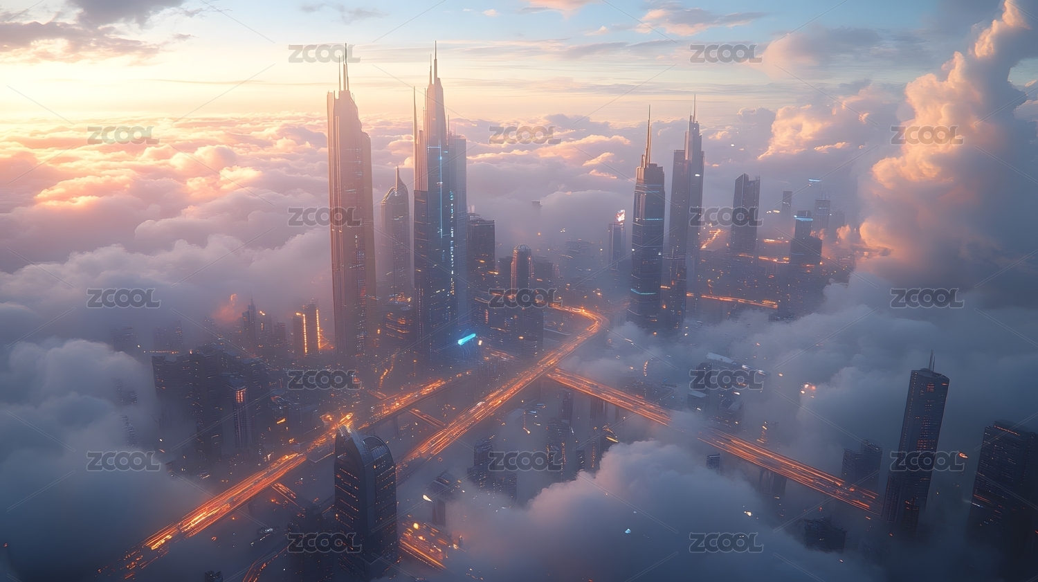薄雾中阳光洒在摩天高楼上的城市早晨